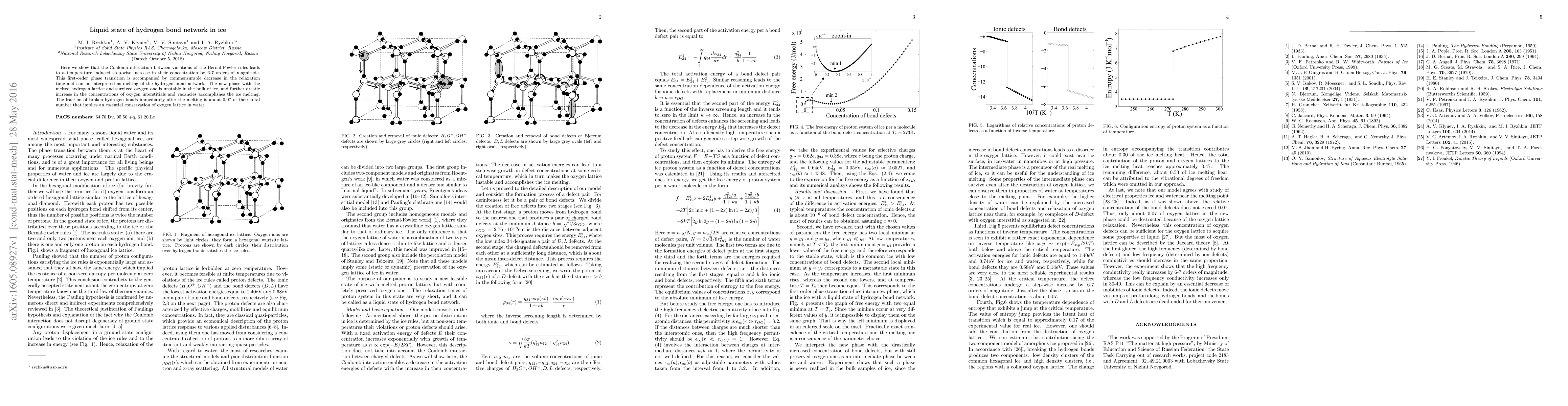 Here we show that the Coulomb interaction between violations of the Bernal-Fowler rules leads to a temperature induced step-wise increase in their concentration by 6-7 orders of magnitude. This first-order phase transition is accompanied by commensurable decrease in the relaxation time and can be interpreted as melting of the hydrogen bond network. The new phase with the melted hydrogen lattice and survived oxygen one is unstable in the bulk of ice, and further drastic increase in the concentrations of oxygen interstitials and vacancies accomplishes the ice melting. The fraction of broken hydrogen bonds immediately after the melting is about 0.07 of their total number that implies an essential conservation of oxygen lattice in water.