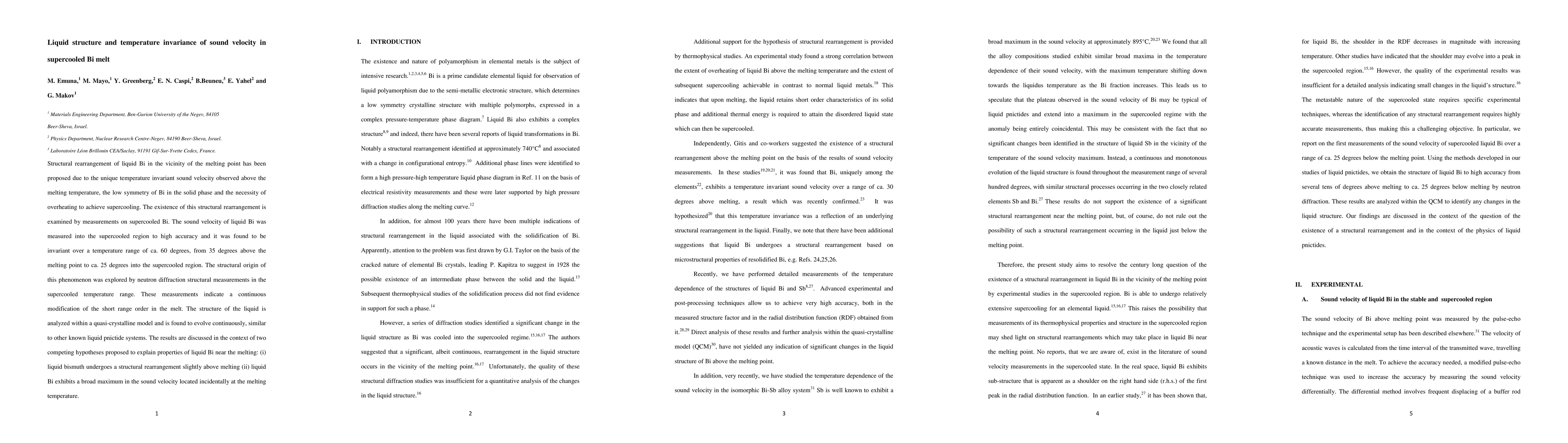 Structural rearrangement of liquid Bi in the vicinity of the melting point has been proposed due to the unique temperature invariant sound velocity observed above the melting temperature, the low symmetry of Bi in the solid phase and the necessity of overheating to achieve supercooling. The existence of this structural rearrangement is examined by measurements on supercooled Bi. The sound velocity of liquid Bi was measured into the supercooled region to high accuracy and it was found to be invariant over a temperature range of ca. 60 degrees, from 35 degrees above the melting point to ca. 25 degrees into the supercooled region. The structural origin of this phenomenon was explored by neutron diffraction structural measurements in the supercooled temperature range. These measurements indicate a continuous modification of the short range order in the melt. The structure of the liquid is analyzed within a quasi-crystalline model and is found to evolve continuously, similar to other known liquid pnictide systems. The results are discussed in the context of two competing hypotheses proposed to explain properties of liquid Bi near the melting: (i) liquid bismuth undergoes a structural rearrangement slightly above melting (ii) liquid Bi exhibits a broad maximum in the sound velocity located incidentally at the melting temperature.