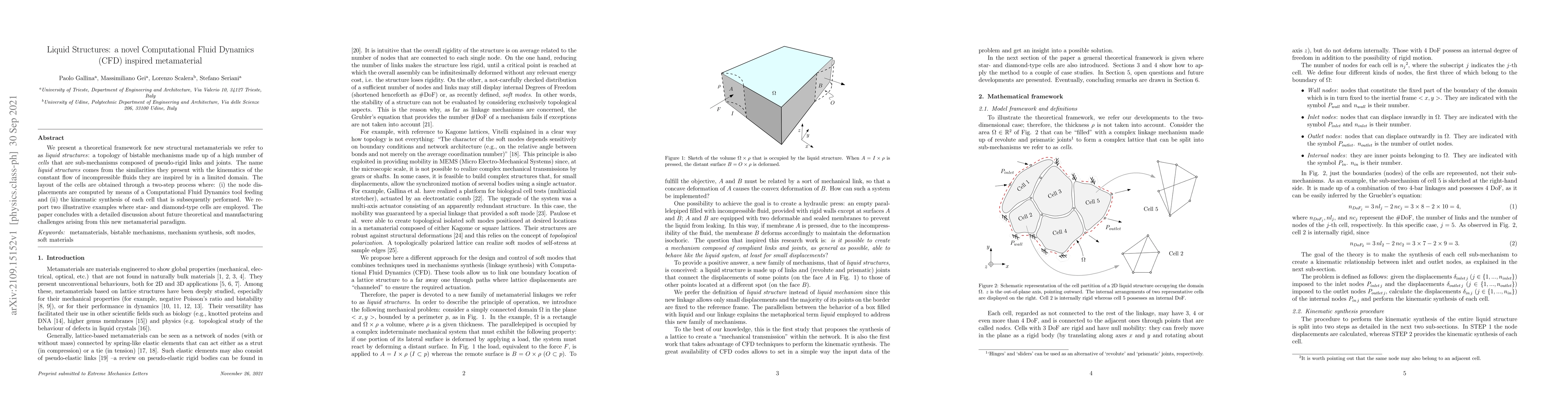 We present a theoretical framework for new structural metamaterials we refer to as liquid structures: a topology of bistable mechanisms made up of a high number of cells that are sub-mechanisms composed of pseudo-rigid links and joints. The name liquid structures comes from the similarities they present with the kinematics of the constant flow of incompressible fluids they are inspired by in a limited domain. The layout of the cells are obtained through a two-step process where: (i) the node displacements are computed by means of a Computational Fluid Dynamics tool feeding and (ii) the kinematic synthesis of each cell that is subsequently performed. We report two illustrative examples where star- and diamond-type cells are employed. The paper concludes with a detailed discussion about future theoretical and manufacturing challenges arising from this new metamaterial paradigm.