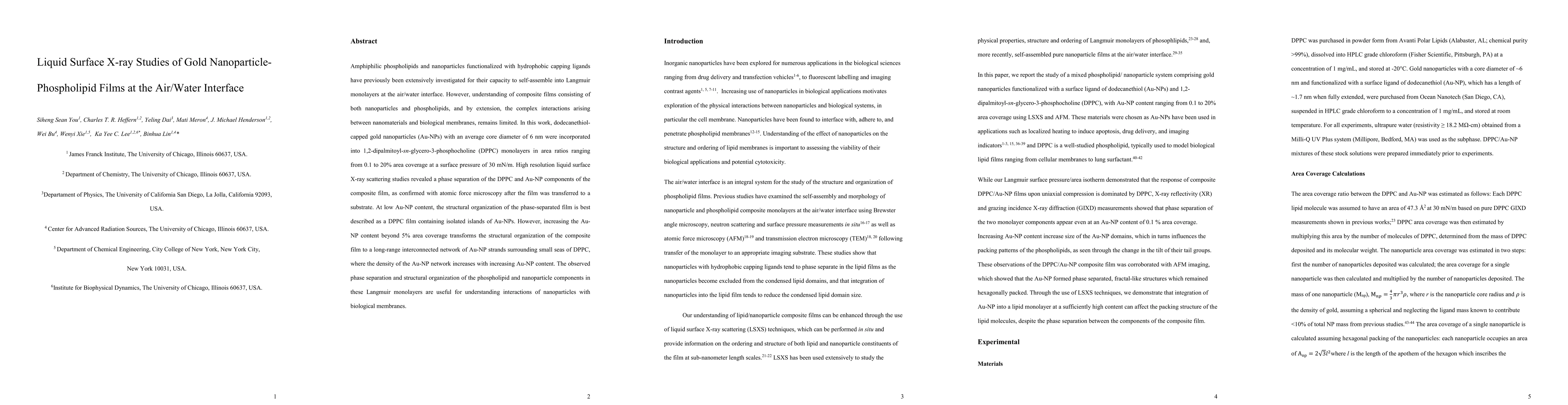 Amphiphilic phospholipids and nanoparticles functionalized with hydrophobic capping ligands have previously been extensively investigated for their capacity to self-assemble into Langmuir monolayers at the air/water interface. However, understanding of composite films consisting of both nanoparticles and phospholipids, and by extension, the complex interactions arising between nanomaterials and biological membranes, remains limited. In this work, dodecanethiol-capped gold nanoparticles (Au-NPs) with an average core diameter of 6 nm were incorporated into 1,2-dipalmitoyl-sn-glycero-3-phosphocholine (DPPC) monolayers in area ratios ranging from 0.1 to 20% area coverage at a surface pressure of 30 mN/m. High resolution liquid surface X-ray scattering studies revealed a phase separation of the DPPC and Au-NP components of the composite film, as confirmed with atomic force microscopy after the film was transferred to a substrate. At low Au-NP content, the structural organization of the phase-separated film is best described as a DPPC film containing isolated islands of Au-NPs. However, increasing the Au-NP content beyond 5% area coverage transforms the structural organization of the composite film to a long-range interconnected network of Au-NP strands surrounding small seas of DPPC, where the density of the Au-NP network increases with increasing Au-NP content. The observed phase separation and structural organization of the phospholipid and nanoparticle components in these Langmuir monolayers are useful for understanding interactions of nanoparticles with biological membranes.