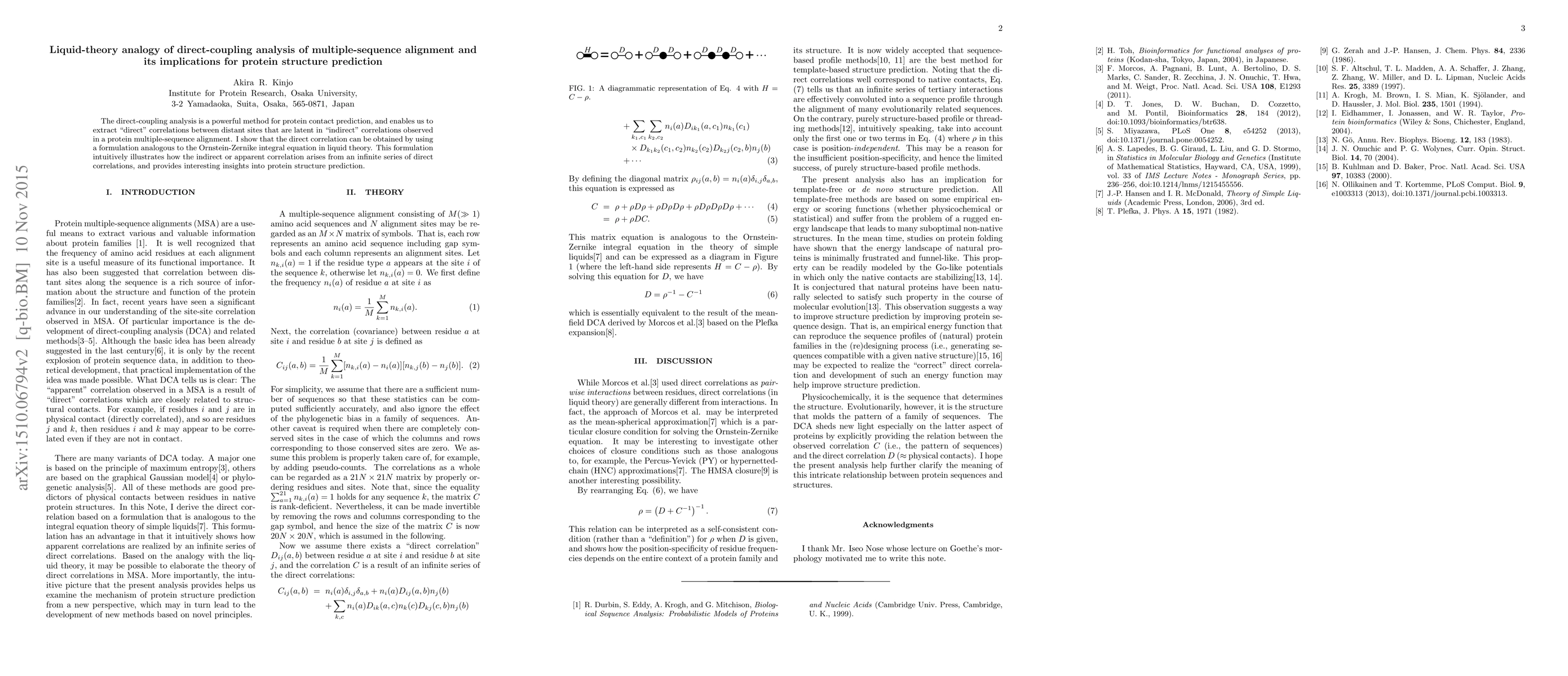 This paper proposes a liquid-theory analogy for direct-coupling analysis in protein contact prediction, demonstrating that direct correlations can be derived using a formulation similar to the Ornstein-Zernike integral equation, offering insights into how indirect correlations emerge from direct interactions and enhancing protein structure prediction.