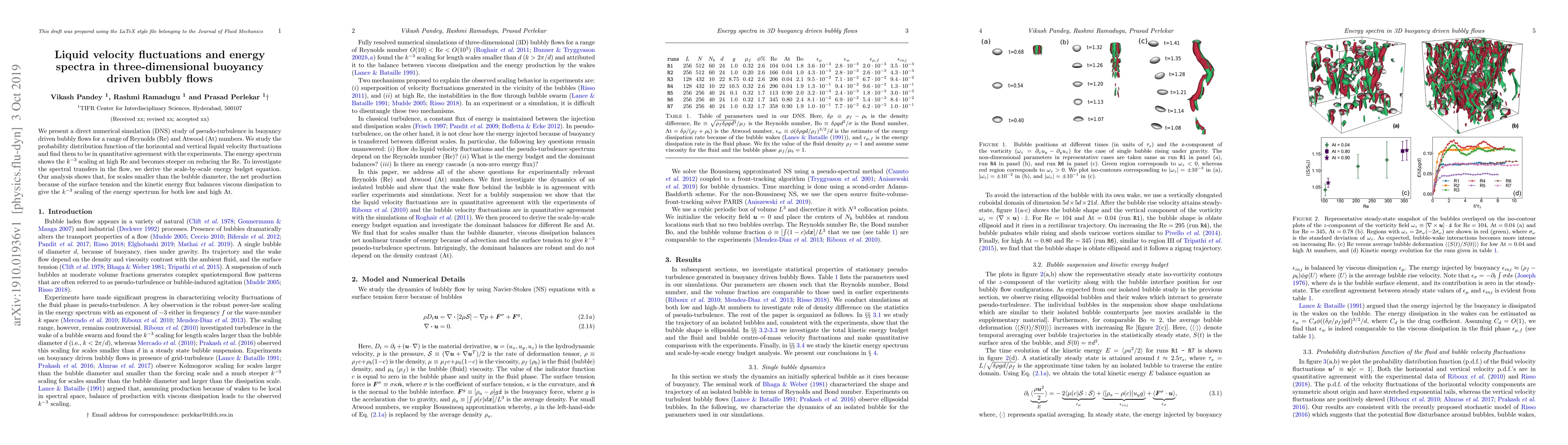 This paper presents a DNS study of buoyancy-driven bubbly flows, revealing that liquid velocity fluctuations match experimental data. The energy spectrum exhibits $k^{-3}$ scaling at high Reynolds numbers, with spectral transfers balancing viscous dissipation and surface tension effects.