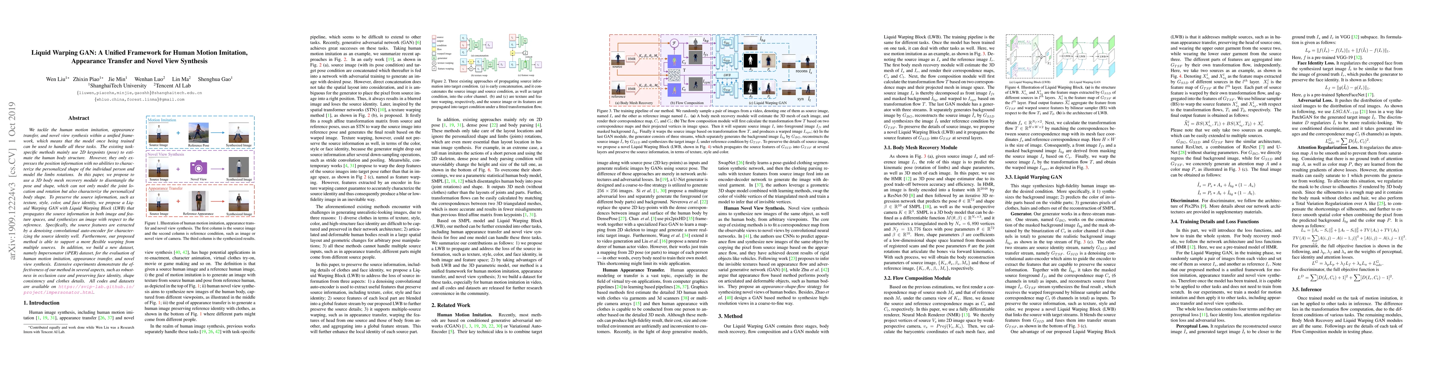 The Liquid Warping GAN framework unifies human motion imitation, appearance transfer, and novel view synthesis by using a 3D body mesh to disentangle pose and shape, enabling personalized modeling and limb rotation. The Liquid Warping Block propagates source information to synthesize images, supported by a denoising convolutional auto-encoder, and is evaluated on the new Impersonator dataset.