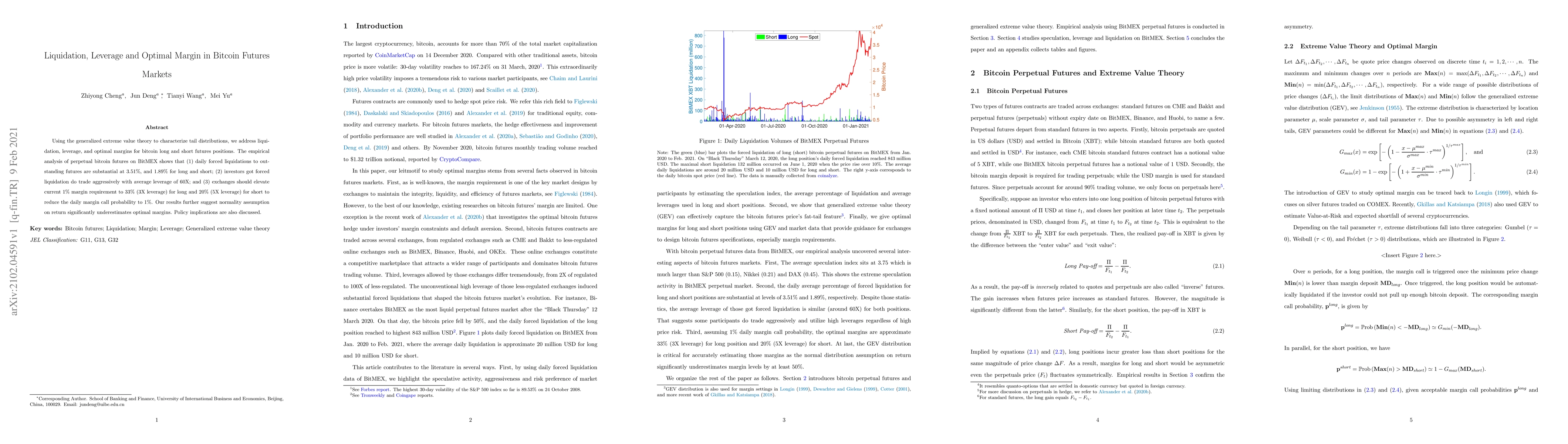 Using the generalized extreme value theory to characterize tail distributions, we address liquidation, leverage, and optimal margins for bitcoin long and short futures positions. The empirical analysis of perpetual bitcoin futures on BitMEX shows that (1) daily forced liquidations to out- standing futures are substantial at 3.51%, and 1.89% for long and short; (2) investors got forced liquidation do trade aggressively with average leverage of 60X; and (3) exchanges should elevate current 1% margin requirement to 33% (3X leverage) for long and 20% (5X leverage) for short to reduce the daily margin call probability to 1%. Our results further suggest normality assumption on return significantly underestimates optimal margins. Policy implications are also discussed.