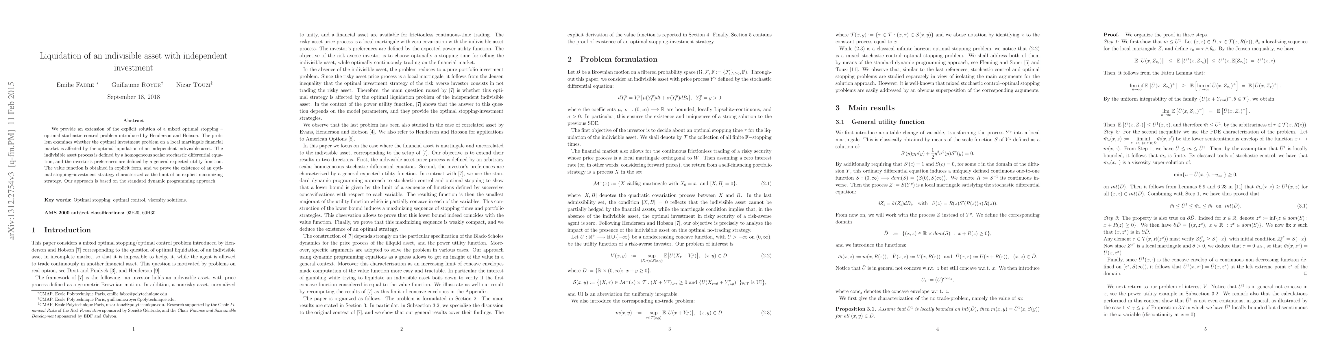 We provide an extension of the explicit solution of a mixed optimal stopping-optimal stochastic control problem introduced by Henderson and Hobson. The problem examines wether the optimal investment problem on a local martingale financial market is affected by the optimal liquidation of an independent indivisible asset. The indivisible asset process is defined by a homogeneous scalar stochastic differential equation, and the investor's preferences are defined by a general expected utility function. The value function is obtained in explicit form, and we prove the existence of an optimal stopping-investment strategy characterized as the limit of an explicit maximizing strategy. Our approach is based on the standard dynamic programming approach.