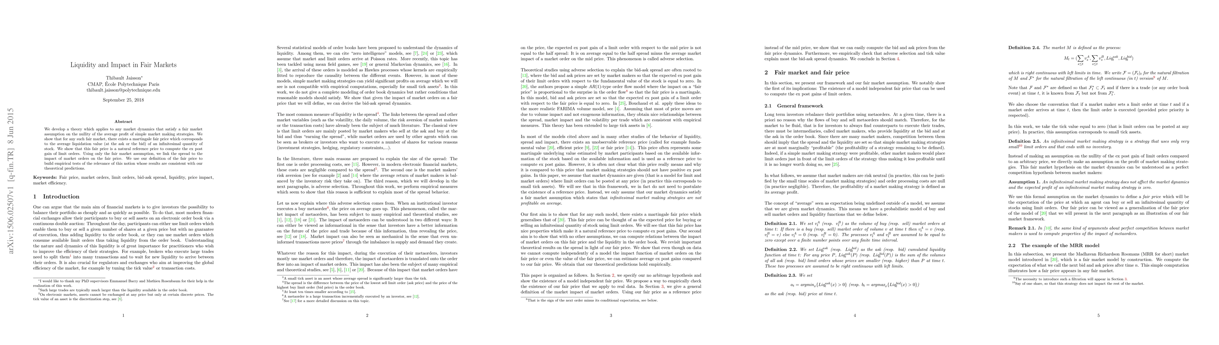 We develop a theory which applies to any market dynamics that satisfy a fair market assumption on the nullity of the average profit of simple market making strategies. We show that for any such fair market, there exists a martingale fair price which corresponds to the average liquidation value (at the ask or the bid) of an infinitesimal quantity of stock. We show that this fair price is a natural reference price to compute the ex post gain of limit orders. Using only the fair market assumption, we link the spread to the impact of market orders on the fair price. We use our definition of the fair price to build empirical tests of the relevance of this notion whose results are consistent with our theoretical predictions.