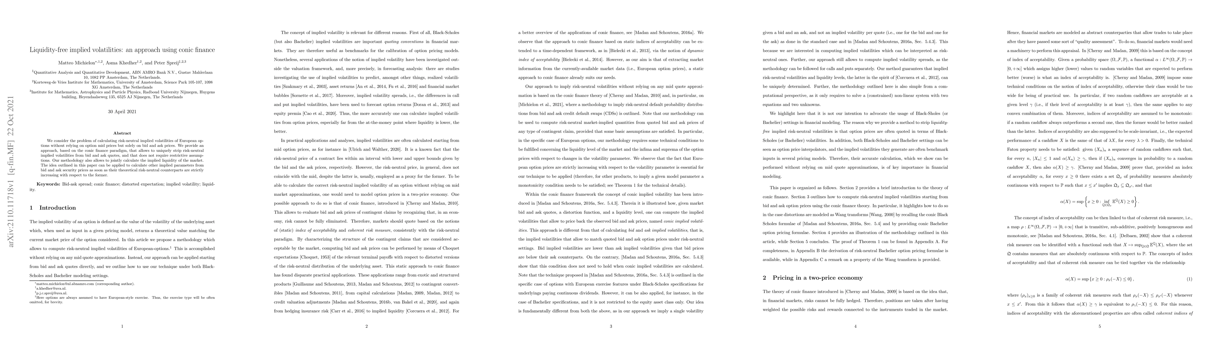 This paper proposes a method for extracting risk-neutral implied volatilities of European options using only bid and ask prices, leveraging the conic finance paradigm. It uniquely determines implied volatilities without restrictive assumptions and also calculates implied liquidity, applicable to other implied parameters under certain theoretical conditions.