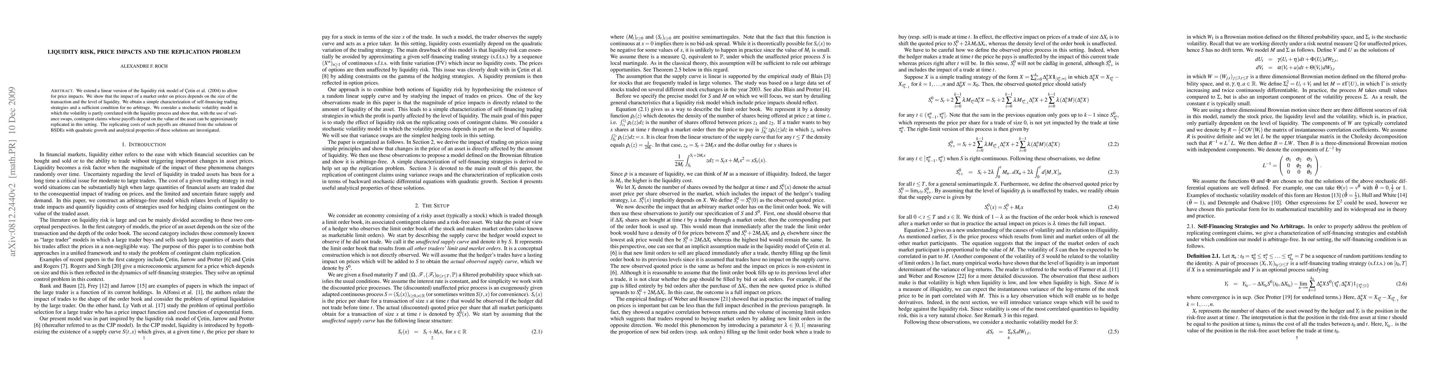 We extend a linear version of the liquidity risk model of Cetin et al. (2004) to allow for price impacts. We show that the impact of a market order on prices depends on the size of the transaction and the level of liquidity. We obtain a simple characterization of self-financing trading strategies and a sufficient condition for no arbitrage. We consider a stochastic volatility model in which the volatility is partly correlated with the liquidity process and show that, with the use of variance swaps, contingent claims whose payoffs depend on the value of the asset can be approximately replicated in this setting. The replicating costs of such payoffs are obtained from the solutions of BSDEs with quadratic growth and analytical properties of these solutions are investigated.