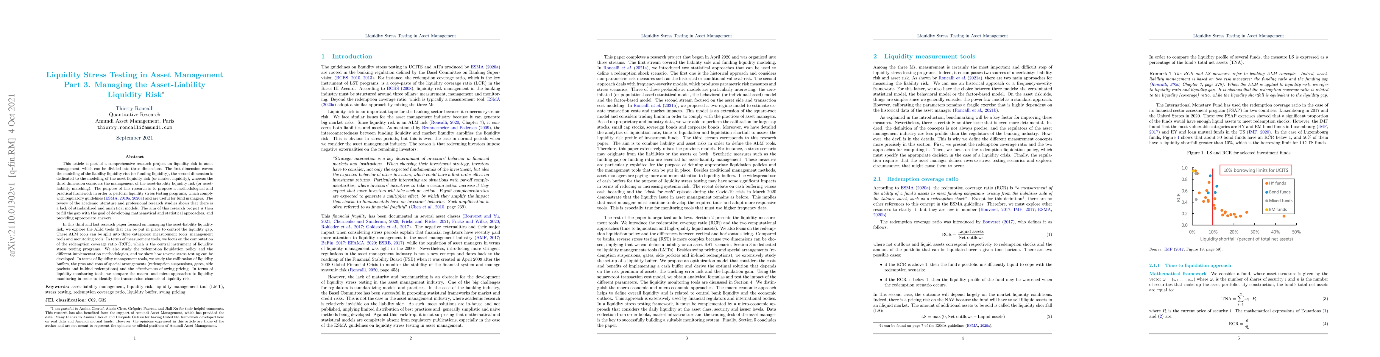 This paper proposes a comprehensive framework for managing asset-liability liquidity risk in asset management, focusing on ALM tools divided into measurement, management, and monitoring tools. It emphasizes the redemption coverage ratio, liquidity buffer calibration, and various monitoring approaches to ensure compliance with regulatory guidelines.