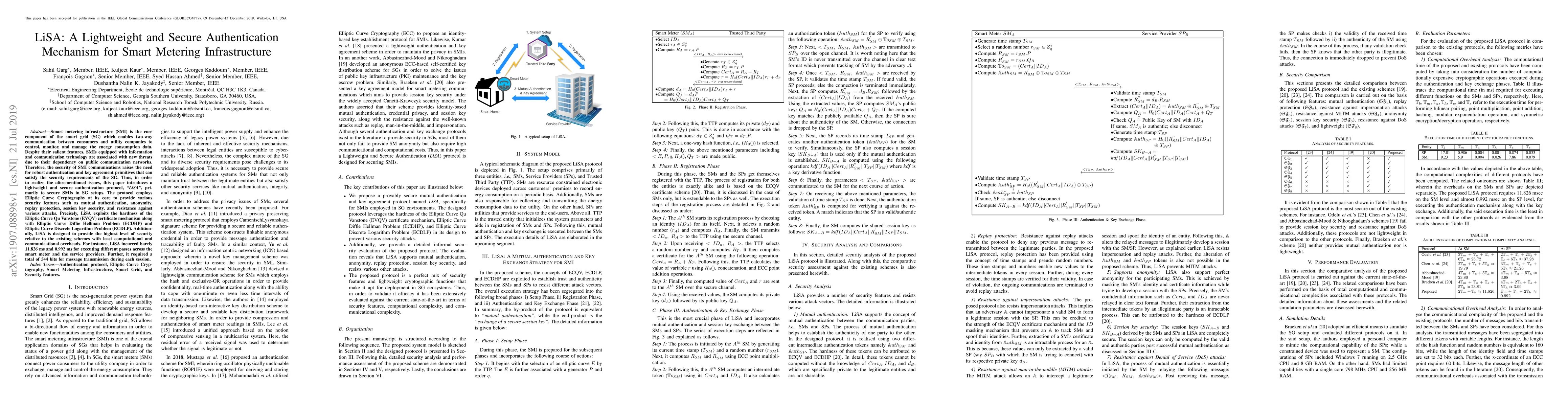 LiSA is a lightweight and secure authentication protocol designed to secure smart metering infrastructure (SMI) in smart grid (SG) setups, employing Elliptic Curve Cryptography to provide mutual authentication, anonymity, and resistance against various attacks. It achieves high security with minimal computational and communication overheads, requiring only 544 bits per session and executing in under 13 ms.