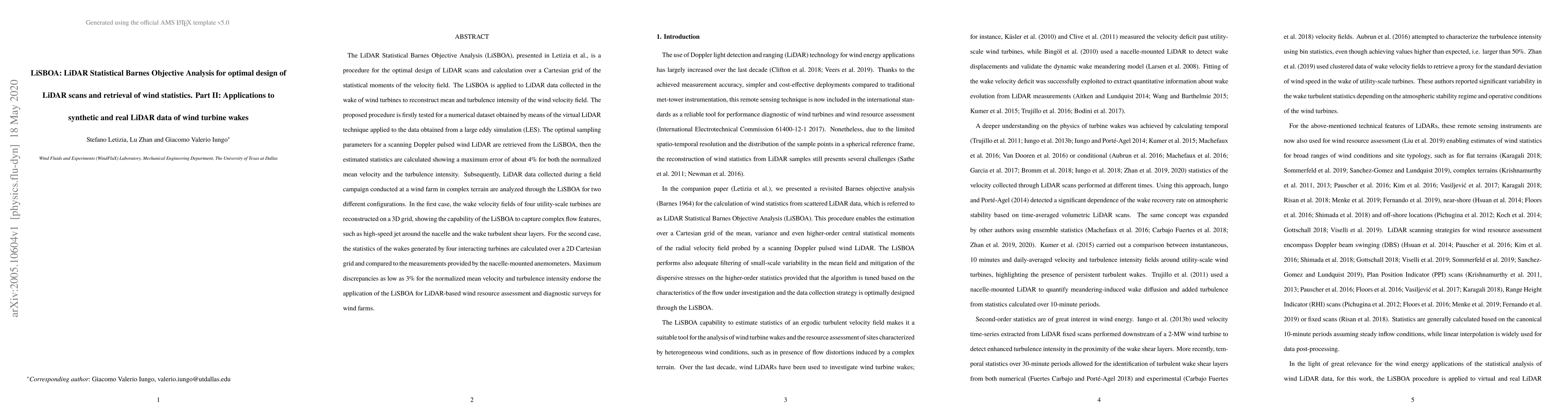 The LiSBOA method optimizes LiDAR scans and retrieves wind statistics from LiDAR data, achieving a maximum error of 4% in synthetic data and 3% in real field data for wind turbine wake analysis. It successfully reconstructs wake velocity fields and turbulence statistics, demonstrating its utility for wind resource assessment.