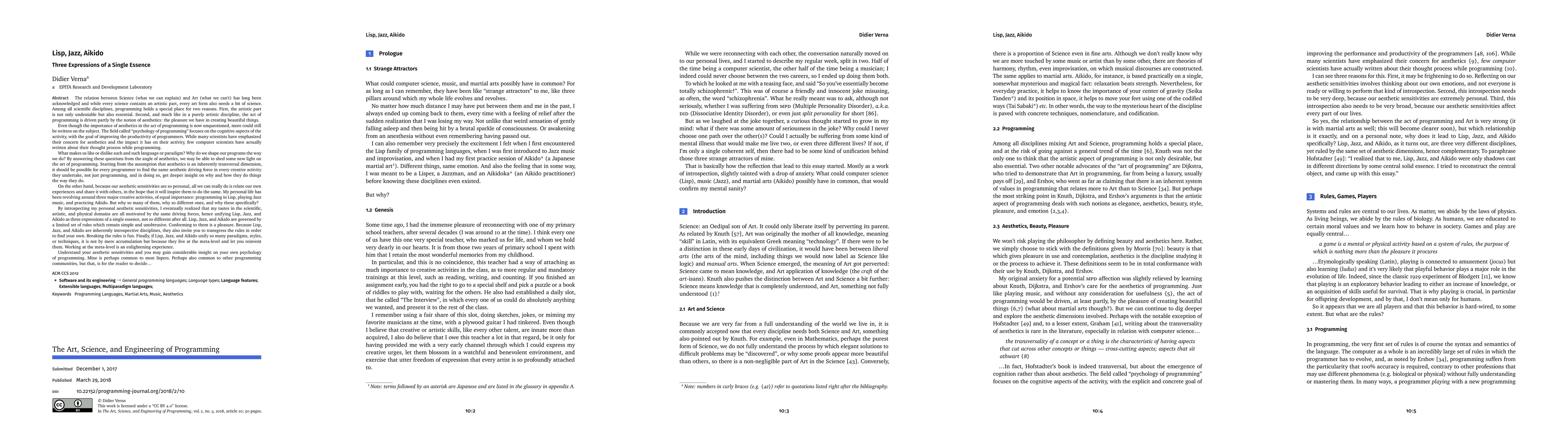 The relation between Science (what we can explain) and Art (what we can't) has long been acknowledged and while every science contains an artistic part, every art form also needs a bit of science. Among all scientific disciplines, programming holds a special place for two reasons. First, the artistic part is not only undeniable but also essential. Second, and much like in a purely artistic discipline, the act of programming is driven partly by the notion of aesthetics: the pleasure we have in creating beautiful things. Even though the importance of aesthetics in the act of programming is now unquestioned, more could still be written on the subject. The field called "psychology of programming" focuses on the cognitive aspects of the activity, with the goal of improving the productivity of programmers. While many scientists have emphasized their concern for aesthetics and the impact it has on their activity, few computer scientists have actually written about their thought process while programming. What makes us like or dislike such and such language or paradigm? Why do we shape our programs the way we do? By answering these questions from the angle of aesthetics, we may be able to shed some new light on the art of programming. Starting from the assumption that aesthetics is an inherently transversal dimension, it should be possible for every programmer to find the same aesthetic driving force in every creative activity they undertake, not just programming, and in doing so, get deeper insight on why and how they do things the way they do. On the other hand, because our aesthetic sensitivities are so personal, all we can really do is relate our own experiences and share it with others, in the hope that it will inspire them to do the same. My personal life has been revolving around three major creative activities, of equal importance: programming in Lisp, playing Jazz music, and practicing Aikido. But why so many of them, why so different ones, and why these specifically? By introspecting my personal aesthetic sensitivities, I eventually realized that my tastes in the scientific, artistic, and physical domains are all motivated by the same driving forces, hence unifying Lisp, Jazz, and Aikido as three expressions of a single essence, not so different after all. Lisp, Jazz, and Aikido are governed by a limited set of rules which remain simple and unobtrusive. Conforming to them is a pleasure. Because Lisp, Jazz, and Aikido are inherently introspective disciplines, they also invite you to transgress the rules in order to find your own. Breaking the rules is fun. Finally, if Lisp, Jazz, and Aikido unify so many paradigms, styles, or techniques, it is not by mere accumulation but because they live at the meta-level and let you reinvent them. Working at the meta-level is an enlightening experience. Understand your aesthetic sensitivities and you may gain considerable insight on your own psychology of programming. Mine is perhaps common to most lispers. Perhaps also common to other programming communities, but that, is for the reader to decide...