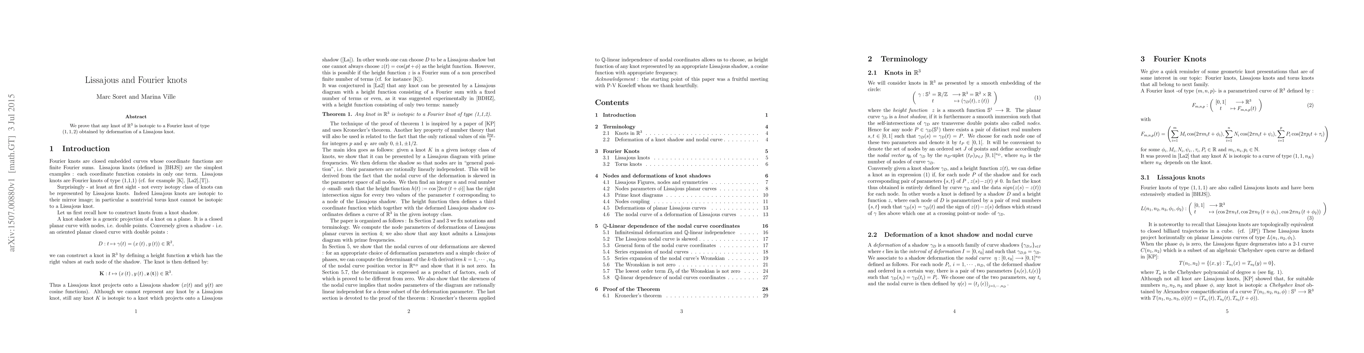 Summary: This paper demonstrates that any knot in three-dimensional space is equivalent to a Fourier knot of type (1,1,2), which can be derived through the deformation of a Lissajous knot. The study bridges classical knot theory with Fourier analysis.