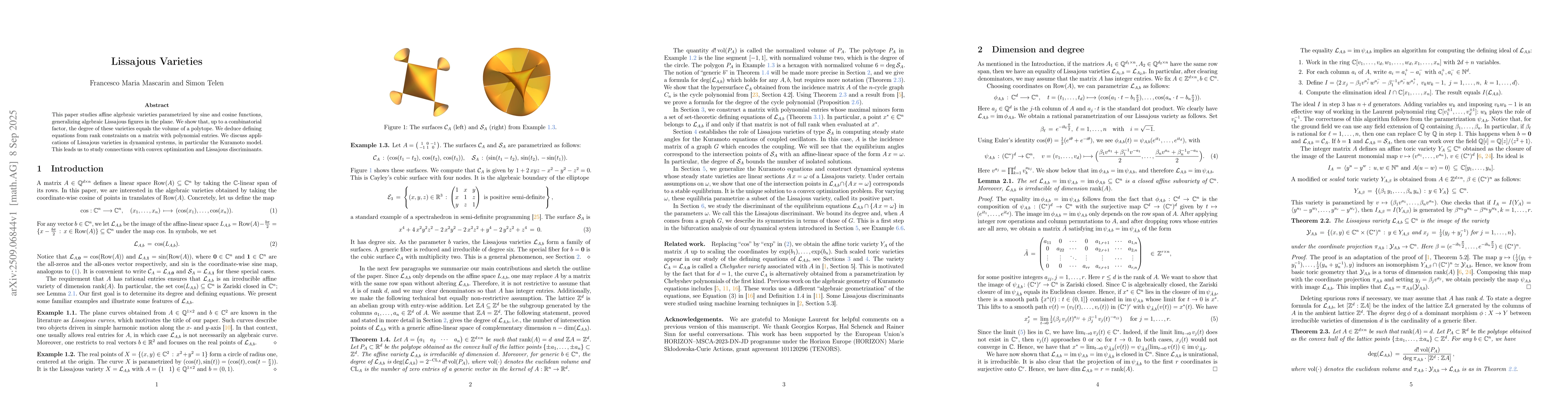 This paper studies affine algebraic varieties parametrized by sine and cosine functions, generalizing algebraic Lissajous figures in the plane. We show that, up to a combinatorial factor, the degree of these varieties equals the volume of a polytope. We deduce defining equations from rank constraints on a matrix with polynomial entries. We discuss applications of Lissajous varieties in dynamical systems, in particular the Kuramoto model. This leads us to study connections with convex optimization and Lissajous discriminants.