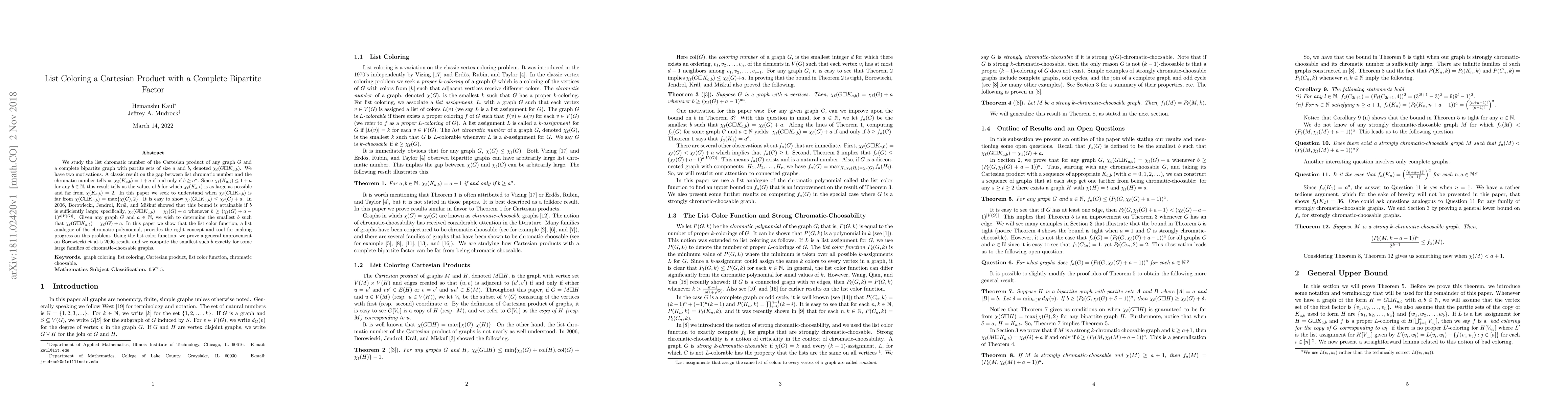 This paper investigates the list chromatic number of Cartesian products involving a graph $G$ and a complete bipartite graph $K_{a,b}$, denoted $\chi_\ell(G \square K_{a,b})$. It aims to determine the smallest $b$ such that $\chi_\ell(G \square K_{a,b})$ equals $\chi_\ell(G) + a$, using the list color function as a tool for analysis.