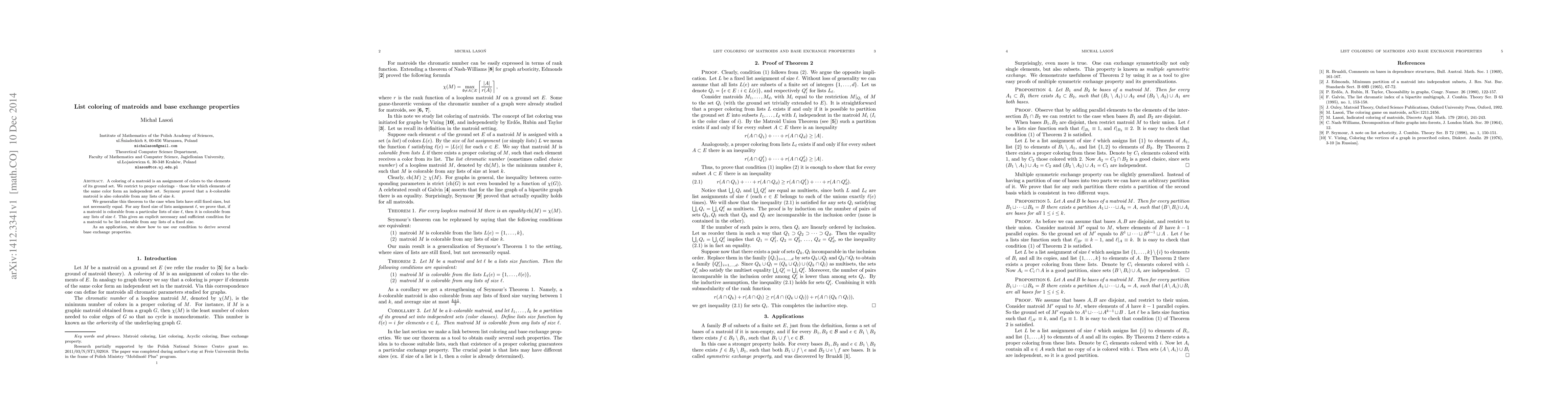 A matroid is colorable from a set of lists if its elements can be assigned colors without violating independence; the paper proves that if a matroid is colorable from any list of size $ heta$, it's also colorable from any other list of the same size, providing an explicit condition for list colorability.