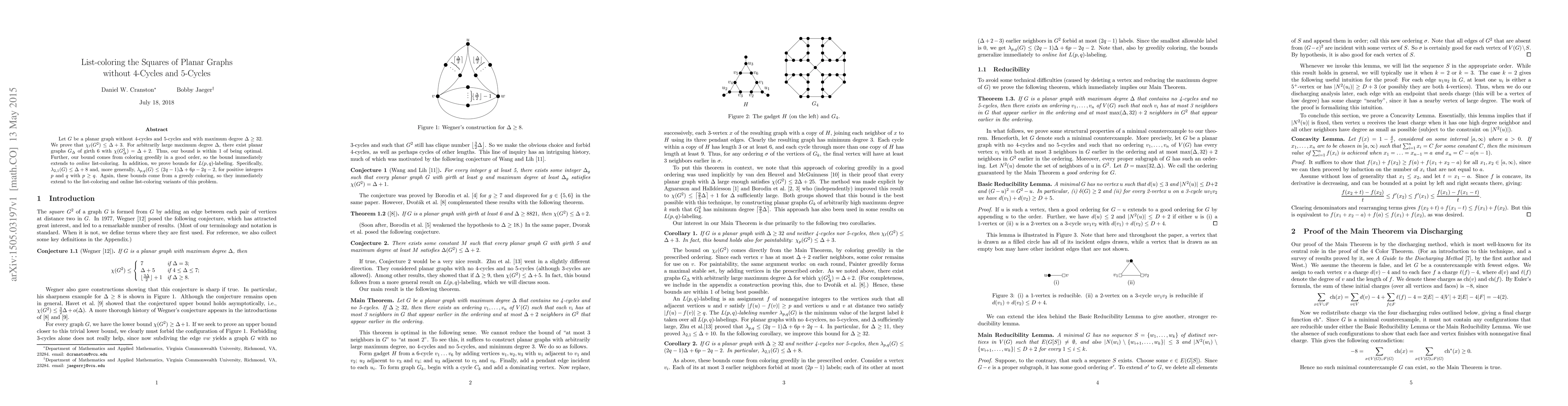 Let $G$ be a planar graph without 4-cycles and 5-cycles and with maximum degree $\Delta\ge 32$. We prove that $\chi_{\ell}(G^2)\le \Delta+3$. For arbitrarily large maximum degree $\Delta$, there exist planar graphs $G_{\Delta}$ of girth 6 with $\chi(G_{\Delta}^2)=\Delta+2$. Thus, our bound is within 1 of being optimal. Further, our bound comes from coloring greedily in a good order, so the bound immediately extends to online list-coloring. In addition, we prove bounds for $L(p,q)$-labeling. Specifically, $\lambda_{2,1}(G)\le \Delta+8$ and, more generally, $\lambda_{p,q}(G)\le (2q-1)\Delta+6p-2q-2$, for positive integers $p$ and $q$ with $p\ge q$. Again, these bounds come from a greedy coloring, so they immediately extend to the list-coloring and online list-coloring variants of this problem.