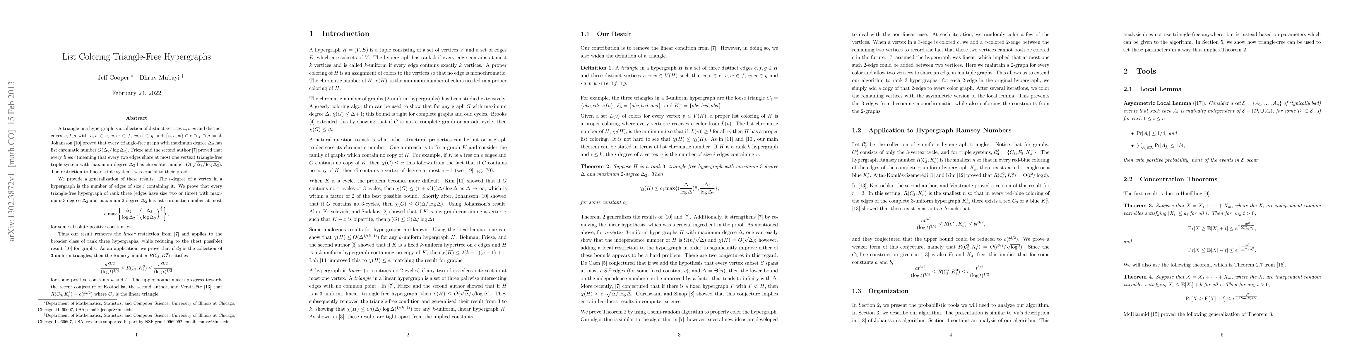 A triangle in a hypergraph is a collection of distinct vertices u,v,w and distinct edges e,f,g with u,v \in e, v,w \in f, w,u \in g, and \{u,v,w\} \cap e \cap f \cap g=\emptyset. The i-degree of a vertex in a hypergraph is the number of edges of size i containing it. We prove that every triangle-free hypergraph of rank three (edges have size two or three) with maximum 3-degree \Delta_3 and maximum 2-degree \Delta_2 has list chromatic number at most c max{\Delta_2/ log{\Delta_2}}, (\Delta_3 / log{\Delta_3})^(1/2)} for some absolute positive constant c. This generalizes a result of Johansson and a result of Frieze and the second author.