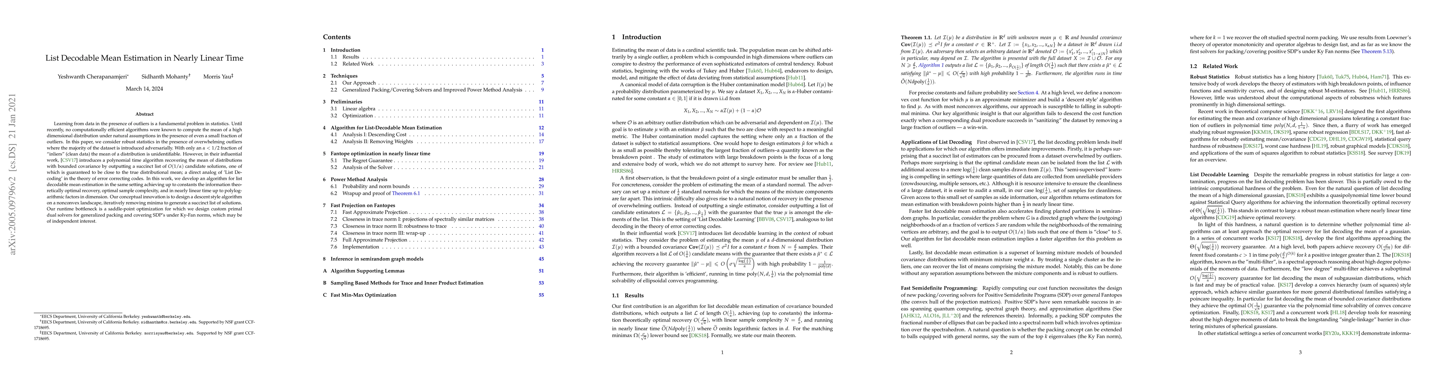 This paper presents an efficient algorithm for estimating the mean of high-dimensional distributions under heavy outlier contamination, achieving nearly linear time complexity. It leverages a descent-style approach to iteratively refine a list of candidate solutions, optimizing a saddle-point problem using custom primal dual solvers.