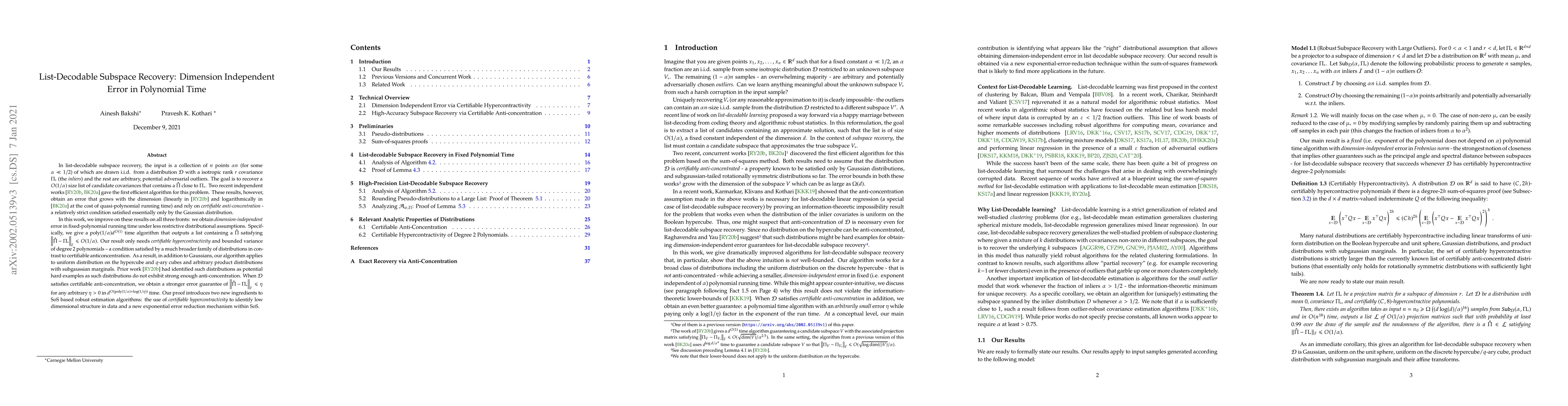 In list-decodable subspace recovery, the input is a collection of $n$ points $\alpha n$ (for some $\alpha \ll 1/2$) of which are drawn i.i.d. from a distribution $\mathcal{D}$ with a isotropic rank $r$ covariance $\Pi_*$ (the \emph{inliers}) and the rest are arbitrary, potential adversarial outliers. The goal is to recover a $O(1/\alpha)$ size list of candidate covariances that contains a $\hat{\Pi}$ close to $\Pi_*$. Two recent independent works (Raghavendra-Yau, Bakshi-Kothari 2020) gave the first efficient algorithm for this problem. These results, however, obtain an error that grows with the dimension (linearly in [RY] and logarithmically in BK) at the cost of quasi-polynomial running time) and rely on \emph{certifiable anti-concentration} - a relatively strict condition satisfied essentially only by the Gaussian distribution. In this work, we improve on these results on all three fronts: \emph{dimension-independent} error via a faster fixed-polynomial running time under less restrictive distributional assumptions. Specifically, we give a $poly(1/\alpha) d^{O(1)}$ time algorithm that outputs a list containing a $\hat{\Pi}$ satisfying $\|\hat{\Pi} -\Pi_*\|_F \leq O(1/\alpha)$. Our result only needs $\mathcal{D}$ to have \emph{certifiably hypercontractive} degree 2 polynomials. As a result, in addition to Gaussians, our algorithm applies to the uniform distribution on the hypercube and $q$-ary cubes and arbitrary product distributions with subgaussian marginals. Prior work (Raghavendra and Yau, 2020) had identified such distributions as potential hard examples as such distributions do not exhibit strong enough anti-concentration. When $\mathcal{D}$ satisfies certifiable anti-concentration, we obtain a stronger error guarantee of $\|\hat{\Pi}-\Pi_*\|_F \leq \eta$ for any arbitrary $\eta > 0$ in $d^{O(poly(1/\alpha) + \log (1/\eta))}$ time.