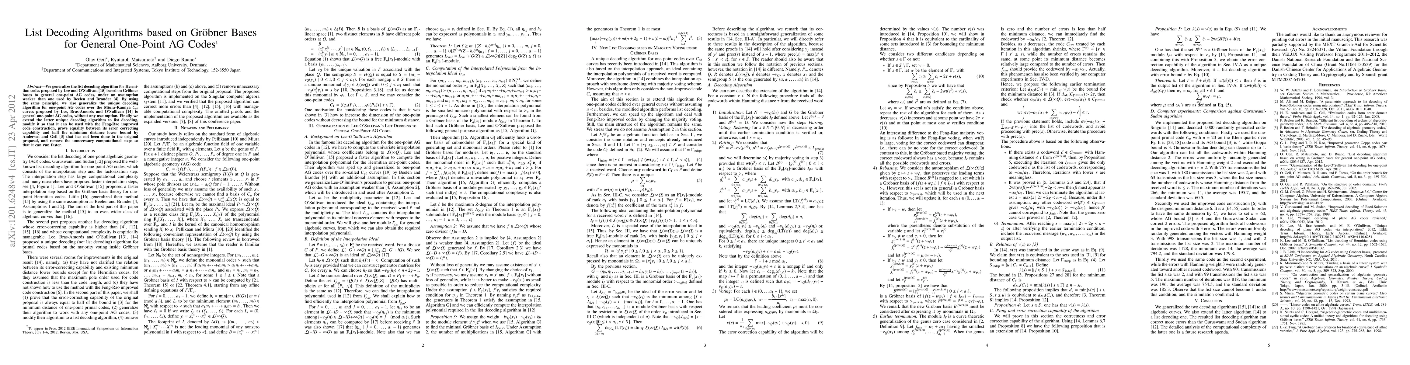 Summary: This paper generalizes list decoding algorithms based on Gröbner bases for Hermitian codes to general one-point AG codes, extends unique decoding algorithms to list decoding, and optimizes the algorithm for faster execution while proving its error-correcting capability.