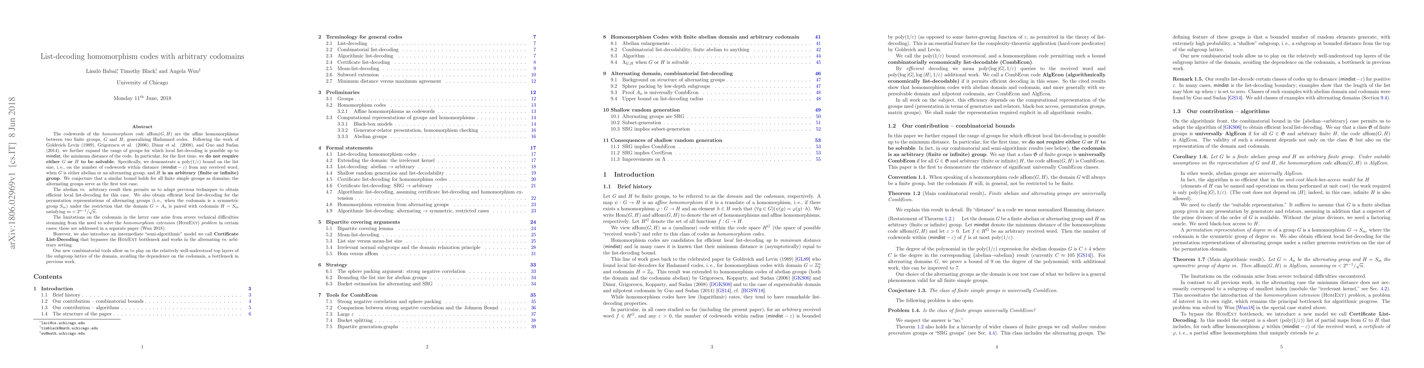 The codewords of the homomorphism code $\operatorname{aHom}(G,H)$ are the affine homomorphisms between two finite groups, $G$ and $H$, generalizing Hadamard codes. Following the work of Goldreich--Levin (1989), Grigorescu et al. (2006), Dinur et al. (2008), and Guo and Sudan (2014), we further expand the range of groups for which local list-decoding is possible up to $\textsf{mindist}$, the minimum distance of the code. In particular, for the first time, we do not require either $G$ or $H$ to be solvable. Specifically, we demonstrate a $\operatorname{poly}(1/\varepsilon)$ bound on the list size, i.e., on the number of codewords within distance $(\textsf{mindist}-\varepsilon)$ from any received word, when $G$ is either abelian or an alternating group, and $H$ is an arbitrary (finite or infinite) group. We conjecture that a similar bound holds for all finite simple groups as domains; the alternating groups serve as the first test case. The abelian vs. arbitrary result then permits us to adapt previous techniques to obtain efficient local list-decoding for this case. We also obtain efficient local list-decoding for the permutation representations of alternating groups (i.e., when the codomain is a symmetric group $S_m$) under the restriction that the domain $G=A_n$ is paired with codomain $H=S_m$ satisfying $m < 2^{n-1}/\sqrt{n}$. The limitations on the codomain in the latter case arise from severe technical difficulties stemming from the need to solve the homomorphism extension (HomExt) problem in certain cases; these are addressed in a separate paper (Wuu 2018). However, we also introduce an intermediate "semi-algorithmic" model we call Certificate List-Decoding that bypasses the HomExt bottleneck and works in the alternating vs. arbitrary setting. A certificate list-decoder produces partial homomorphisms that uniquely extend to the homomorphisms in the list.