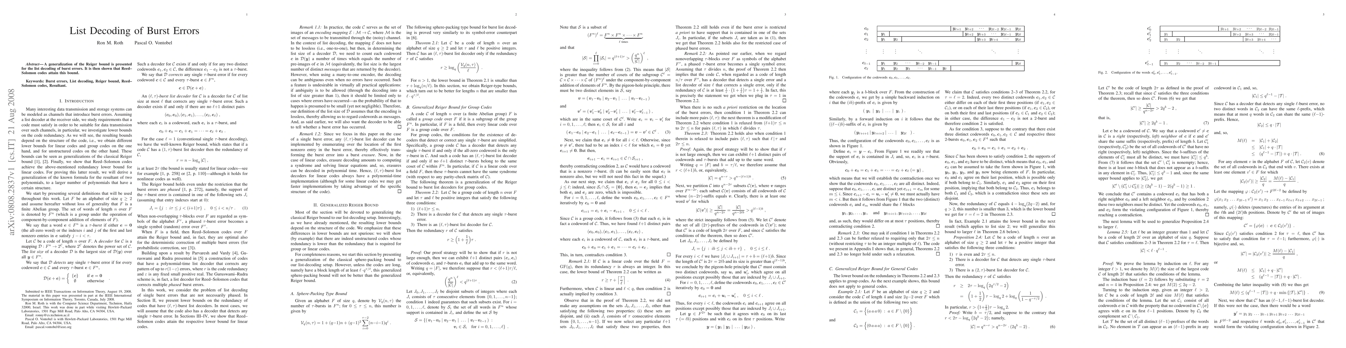 The paper introduces a generalized Reiger bound for burst errors in list decoding and proves that Reed-Solomon codes meet this bound.