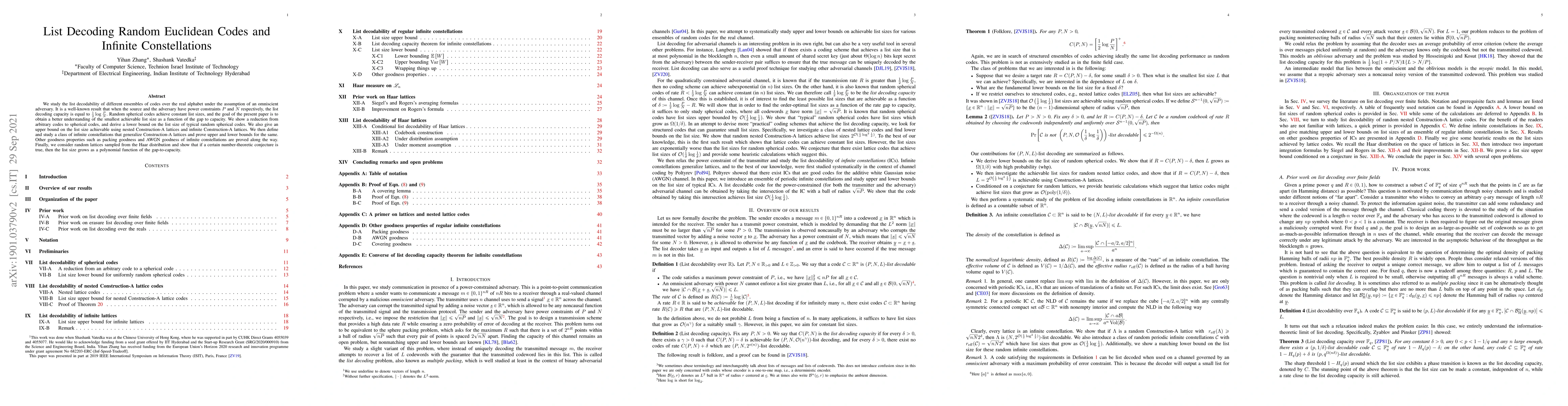 This paper investigates the list decoding capacity of random Euclidean codes under adversarial constraints, focusing on the smallest achievable list size relative to the gap to capacity. It establishes bounds for both spherical codes and infinite constellations, proving upper and lower bounds for their list sizes and exploring their goodness properties.