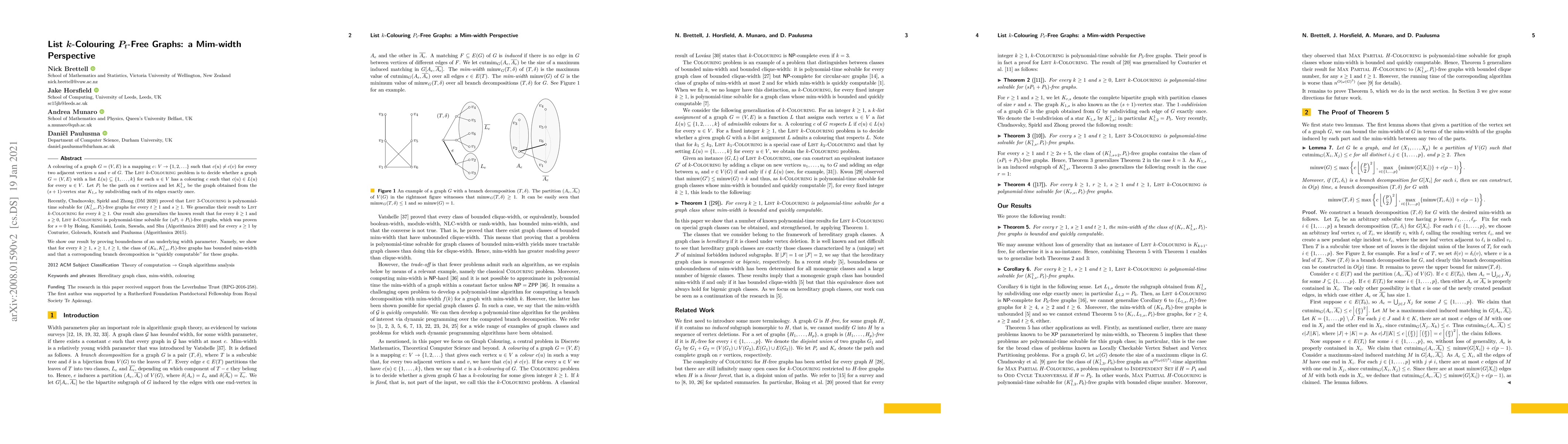 A colouring of a graph $G=(V,E)$ is a mapping $c\colon V\to \{1,2,\ldots\}$ such that $c(u)\neq c(v)$ for every two adjacent vertices $u$ and $v$ of $G$. The {\sc List $k$-Colouring} problem is to decide whether a graph $G=(V,E)$ with a list $L(u)\subseteq \{1,\ldots,k\}$ for each $u\in V$ has a colouring $c$ such that $c(u)\in L(u)$ for every $u\in V$. Let $P_t$ be the path on $t$ vertices and let $K_{1,s}^1$ be the graph obtained from the $(s+1)$-vertex star $K_{1,s}$ by subdividing each of its edges exactly once.Recently, Chudnovsky, Spirkl and Zhong (DM 2020) proved that List $3$-Colouring is polynomial-time solvable for $(K_{1,s}^1,P_t)$-free graphs for every $t\geq 1$ and $s\geq 1$. We generalize their result to List $k$-Colouring for every $k\geq 1$. Our result also generalizes the known result that for every $k\geq 1$ and $s\geq 0$, List $k$-Colouring is polynomial-time solvable for $(sP_1+P_5)$-free graphs, which was proven for $s=0$ by Ho\`ang, Kami\'nski, Lozin, Sawada, and Shu (Algorithmica 2010) and for every $s\geq 1$ by Couturier, Golovach, Kratsch and Paulusma (Algorithmica 2015). We show our result by proving boundedness of an underlying width parameter. Namely, we show that for every $k\geq 1$, $s\geq 1$, $t\geq 1$, the class of $(K_k,K_{1,s}^1,P_t)$-free graphs has bounded mim-width and that a corresponding branch decomposition is "quickly computable" for these graphs.