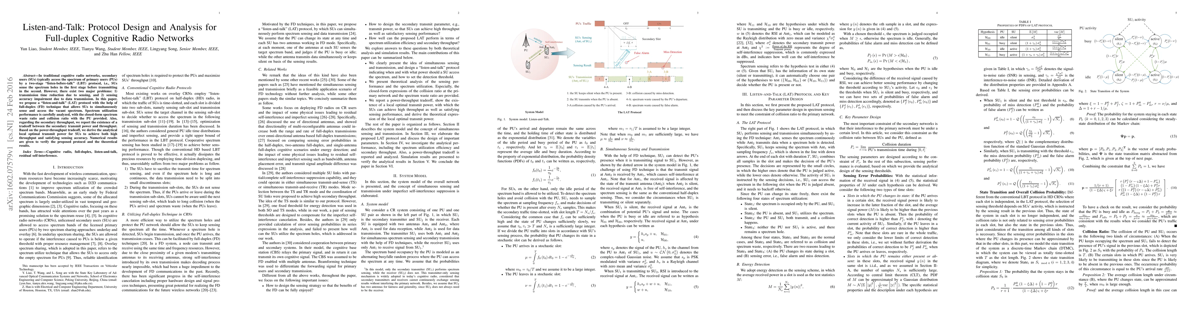 This paper proposes a "listen-and-talk" protocol for full-duplex cognitive radio networks to enable simultaneous spectrum sensing and transmission, addressing issues in traditional "listen-before-talk" methods. Analytical models are developed to analyze spectrum utilization, providing insights into optimal transmit power for maximizing throughput while maintaining sensing accuracy.
