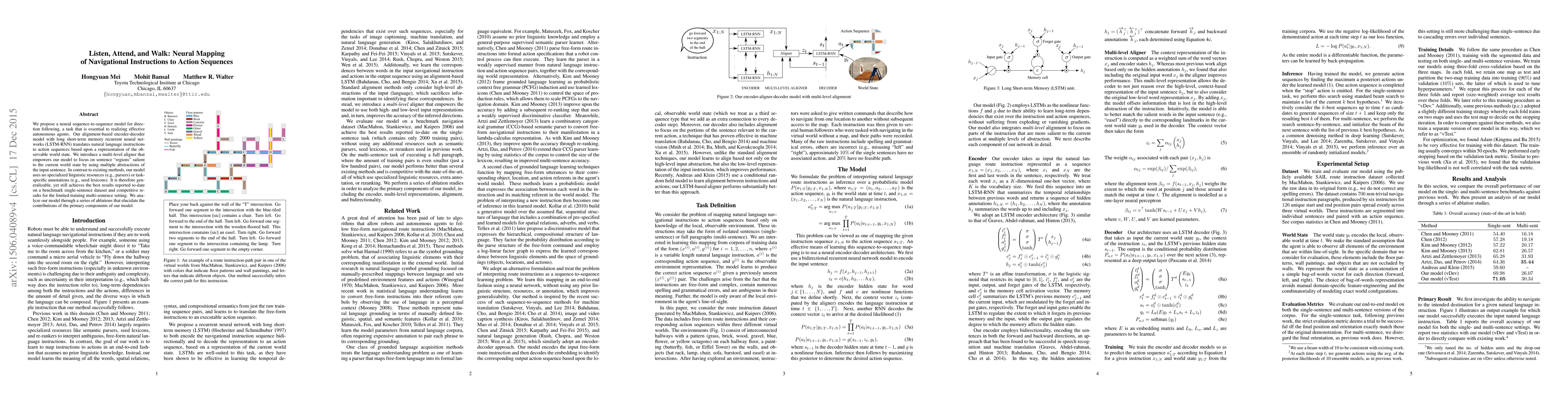 This paper introduces a neural sequence-to-sequence model using LSTM-RNNs to translate natural language navigational instructions into action sequences, employing a multi-level aligner for context-specific focus. The model achieves state-of-the-art results without specialized linguistic resources, demonstrating its generalizability.