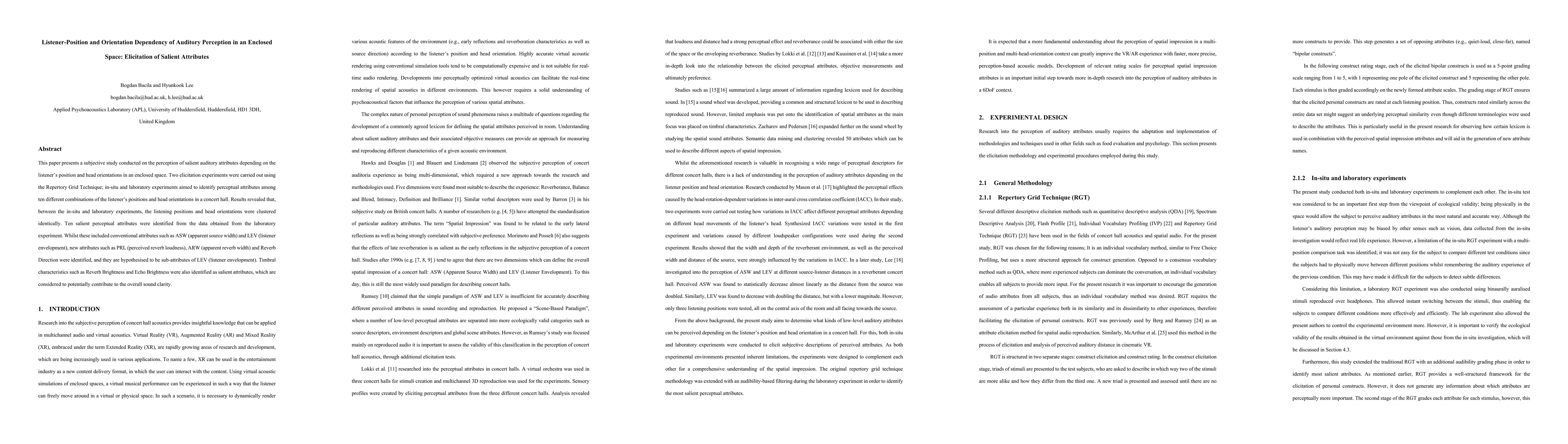 This study investigates how listener position and head orientation influence auditory perception in an enclosed space, identifying ten salient perceptual attributes including conventional and novel factors like perceived reverb loudness and reverb direction. Results from in-situ and laboratory experiments showed consistent clustering of listening positions and orientations.