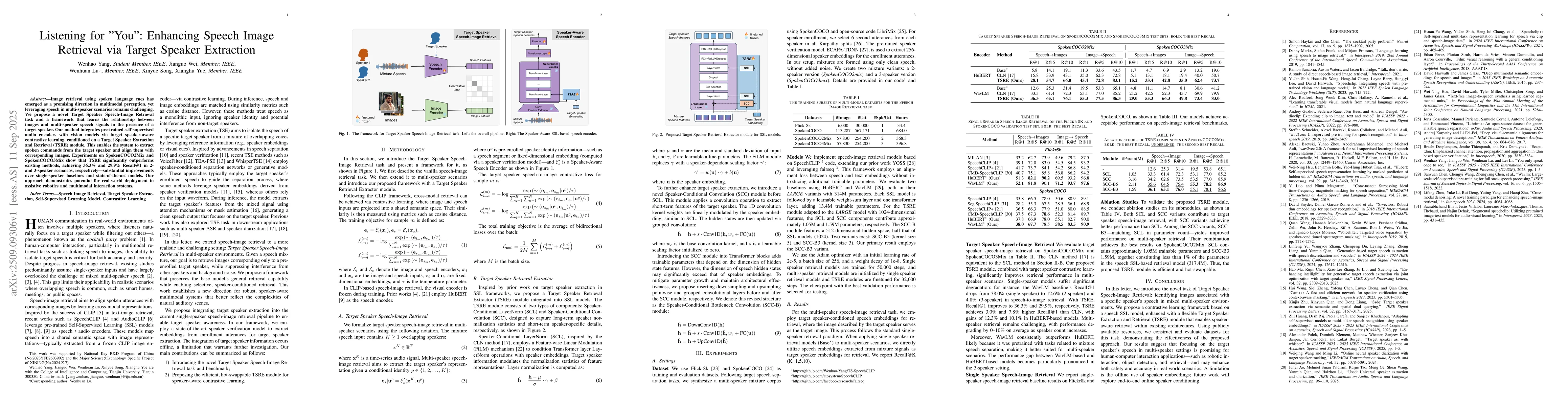 Image retrieval using spoken language cues has emerged as a promising direction in multimodal perception, yet leveraging speech in multi-speaker scenarios remains challenging. We propose a novel Target Speaker Speech-Image Retrieval task and a framework that learns the relationship between images and multi-speaker speech signals in the presence of a target speaker. Our method integrates pre-trained self-supervised audio encoders with vision models via target speaker-aware contrastive learning, conditioned on a Target Speaker Extraction and Retrieval module. This enables the system to extract spoken commands from the target speaker and align them with corresponding images. Experiments on SpokenCOCO2Mix and SpokenCOCO3Mix show that TSRE significantly outperforms existing methods, achieving 36.3% and 29.9% Recall@1 in 2 and 3 speaker scenarios, respectively - substantial improvements over single speaker baselines and state-of-the-art models. Our approach demonstrates potential for real-world deployment in assistive robotics and multimodal interaction systems.