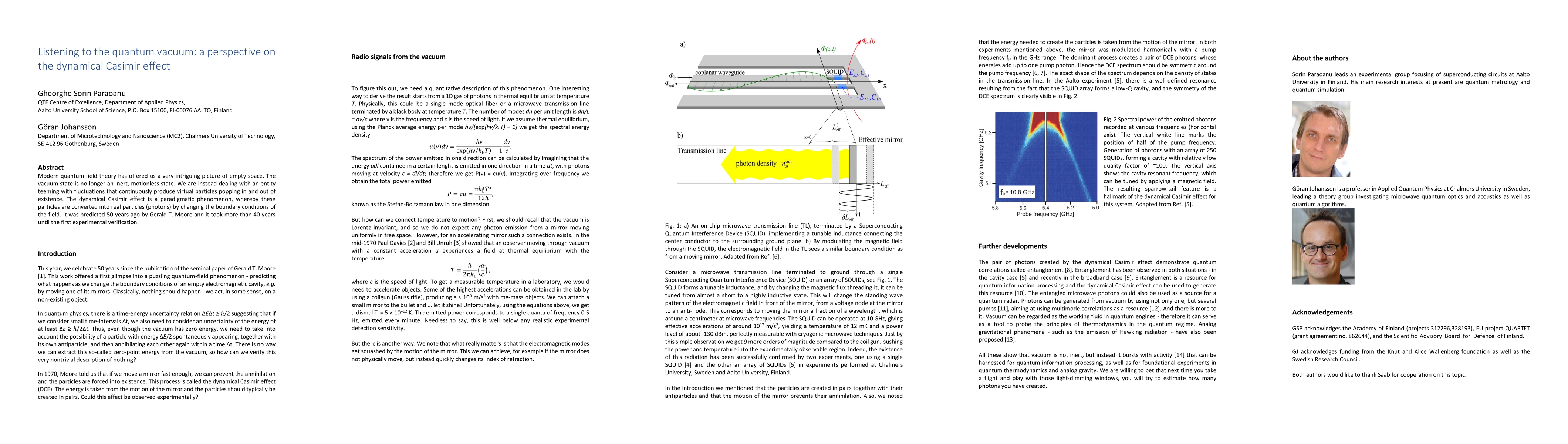 Modern quantum field theory has offered us a very intriguing picture of empty space. The vacuum state is no longer an inert, motionless state. We are instead dealing with an entity teeming with fluctuations that continuously produce virtual particles popping in and out of existence. The dynamical Casimir effect is a paradigmatic phenomenon, whereby these particles are converted into real particles (photons) by changing the boundary conditions of the field. It was predicted 50 years ago by Gerald T. Moore and it took more than 40 years until the first experimental verification.
