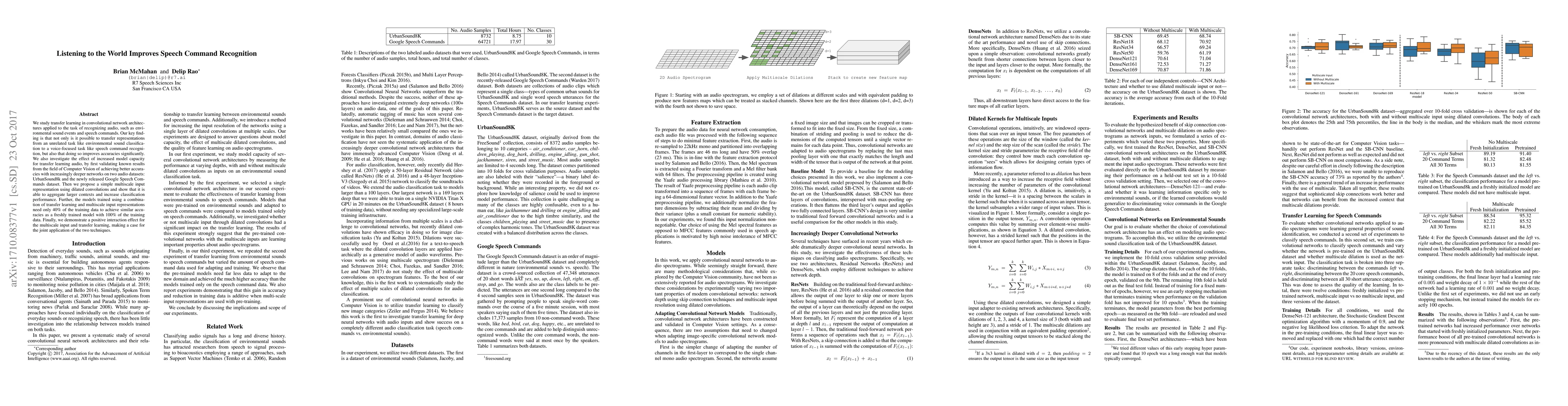 This paper explores transfer learning in convolutional networks for audio recognition, demonstrating that transferring representations from environmental sound classification to speech command recognition enhances accuracy. It also shows that deeper networks and multiscale inputs using dilated convolutions further improve performance, requiring only 40% of the training data for comparable results.