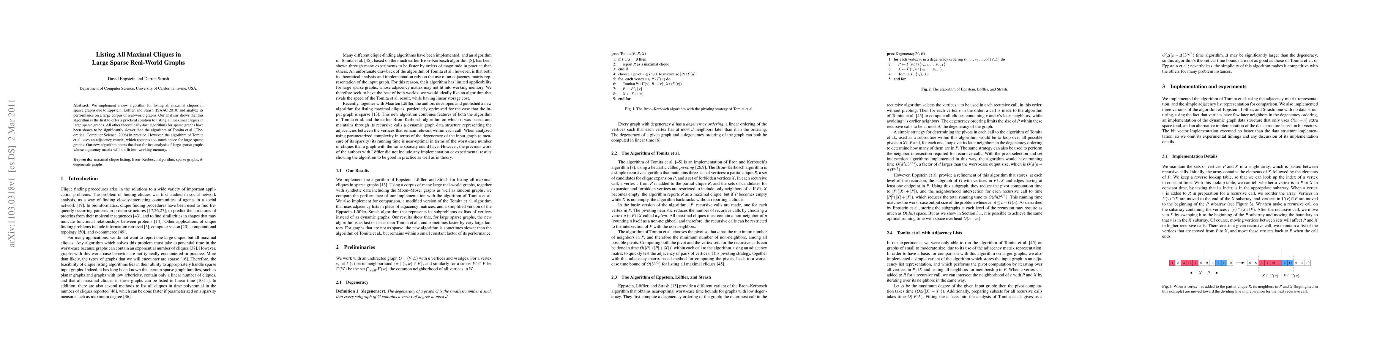 This paper presents an implementation of Eppstein, Löffler, and Strash's algorithm for listing all maximal cliques in sparse graphs, demonstrating its practical efficiency on real-world datasets. It concludes that this method outperforms other theoretically-fast algorithms, especially for large sparse graphs where adjacency matrix storage is infeasible.
