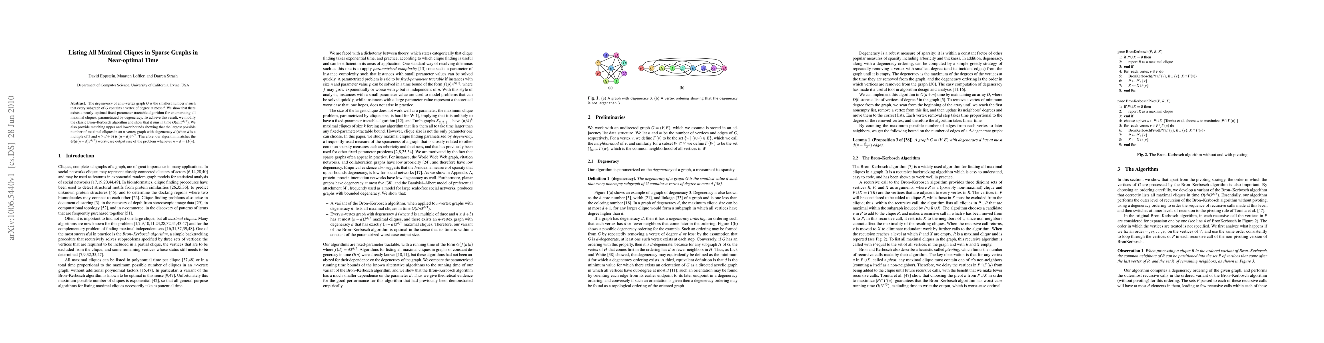 This paper presents a nearly-optimal fixed-parameter tractable algorithm for listing all maximal cliques in sparse graphs, parameterized by the graph's degeneracy, running in time $O(dn3^{d/3})$. The authors modify the Bron-Kerbosch algorithm and provide bounds showing the algorithm's efficiency.