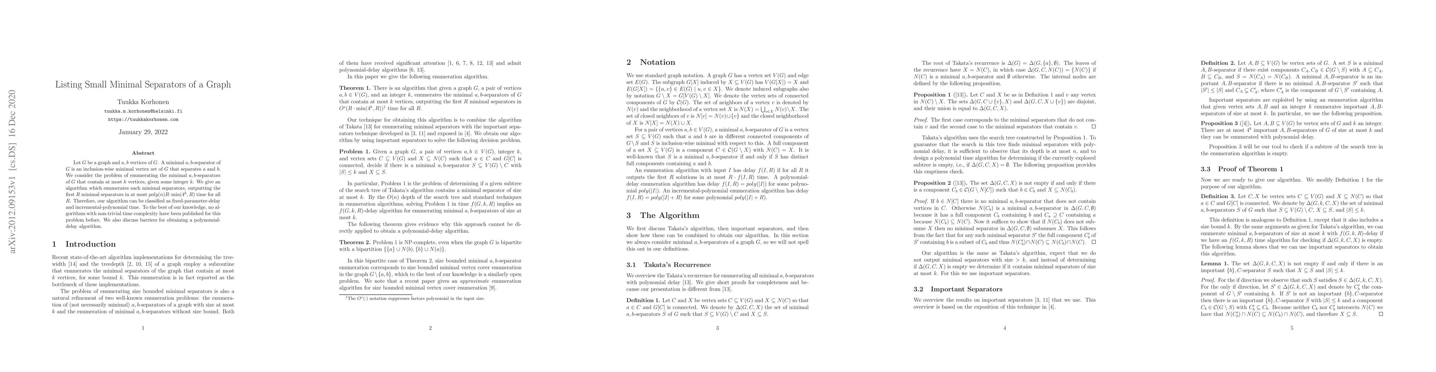 This paper presents an algorithm for enumerating minimal $a,b$-separators in a graph $G$ that contain at most $k$ vertices, achieving fixed-parameter-delay and incremental-polynomial time complexity. To the best of the authors' knowledge, this is the first non-trivial algorithm for this problem.