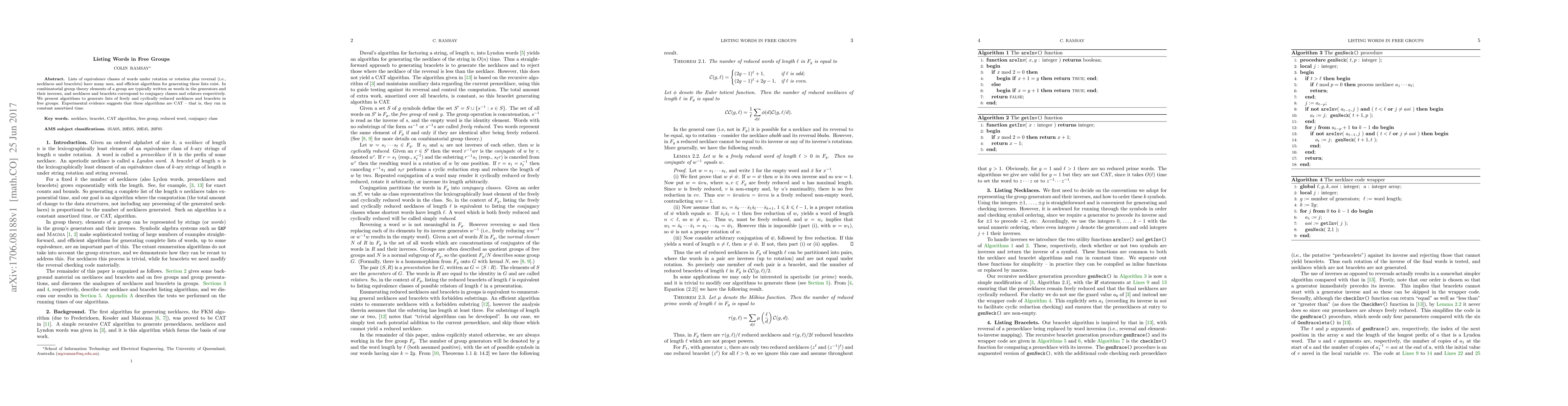 Lists of equivalence classes of words under rotation or rotation plus reversal (i.e., necklaces and bracelets) have many uses, and efficient algorithms for generating these lists exist. In combinatorial group theory elements of a group are typically written as words in the generators and their inverses, and necklaces and bracelets correspond to conjugacy classes and relators respectively. We present algorithms to generate lists of freely and cyclically reduced necklaces and bracelets in free groups. Experimental evidence suggests that these algorithms are CAT -- that is, they run in constant amortized time.