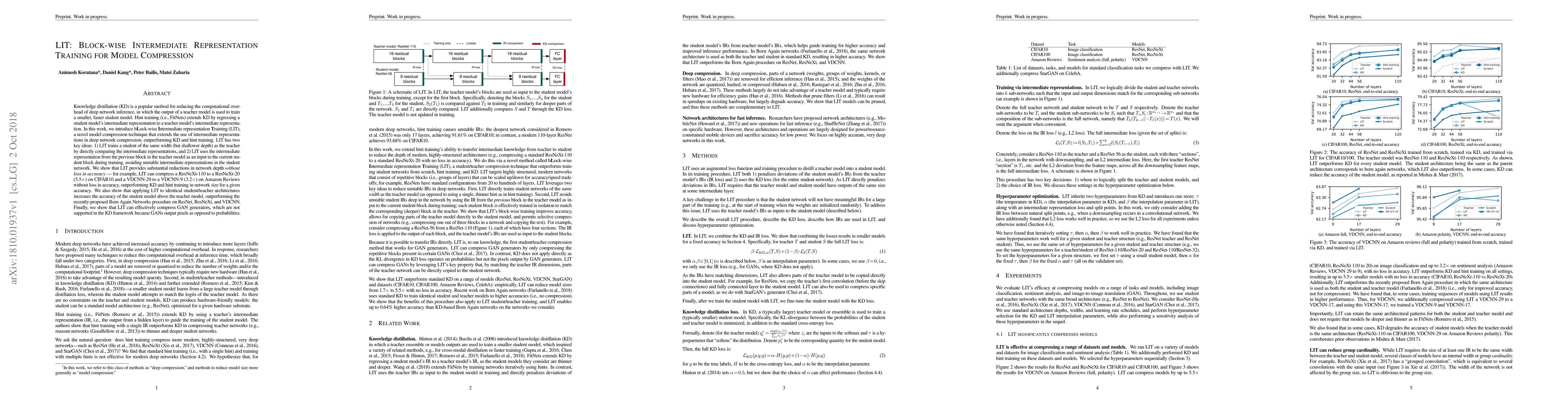 Knowledge distillation (KD) is a popular method for reducing the computational overhead of deep network inference, in which the output of a teacher model is used to train a smaller, faster student model. Hint training (i.e., FitNets) extends KD by regressing a student model's intermediate representation to a teacher model's intermediate representation. In this work, we introduce bLock-wise Intermediate representation Training (LIT), a novel model compression technique that extends the use of intermediate representations in deep network compression, outperforming KD and hint training. LIT has two key ideas: 1) LIT trains a student of the same width (but shallower depth) as the teacher by directly comparing the intermediate representations, and 2) LIT uses the intermediate representation from the previous block in the teacher model as an input to the current student block during training, avoiding unstable intermediate representations in the student network. We show that LIT provides substantial reductions in network depth without loss in accuracy -- for example, LIT can compress a ResNeXt-110 to a ResNeXt-20 (5.5x) on CIFAR10 and a VDCNN-29 to a VDCNN-9 (3.2x) on Amazon Reviews without loss in accuracy, outperforming KD and hint training in network size for a given accuracy. We also show that applying LIT to identical student/teacher architectures increases the accuracy of the student model above the teacher model, outperforming the recently-proposed Born Again Networks procedure on ResNet, ResNeXt, and VDCNN. Finally, we show that LIT can effectively compress GAN generators, which are not supported in the KD framework because GANs output pixels as opposed to probabilities.