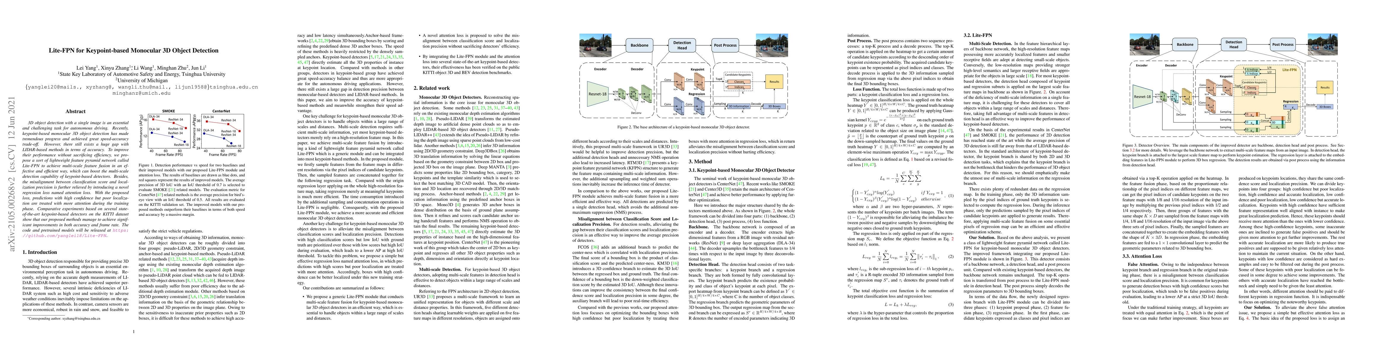 3D object detection with a single image is an essential and challenging task for autonomous driving. Recently, keypoint-based monocular 3D object detection has made tremendous progress and achieved great speed-accuracy trade-off. However, there still exists a huge gap with LIDAR-based methods in terms of accuracy. To improve their performance without sacrificing efficiency, we propose a sort of lightweight feature pyramid network called Lite-FPN to achieve multi-scale feature fusion in an effective and efficient way, which can boost the multi-scale detection capability of keypoint-based detectors. Besides, the misalignment between classification score and localization precision is further relieved by introducing a novel regression loss named attention loss. With the proposed loss, predictions with high confidence but poor localization are treated with more attention during the training phase. Comparative experiments based on several state-of-the-art keypoint-based detectors on the KITTI dataset show that our proposed methods manage to achieve significant improvements in both accuracy and frame rate. The code and pretrained models will be released at \url{https://github.com/yanglei18/Lite-FPN}.