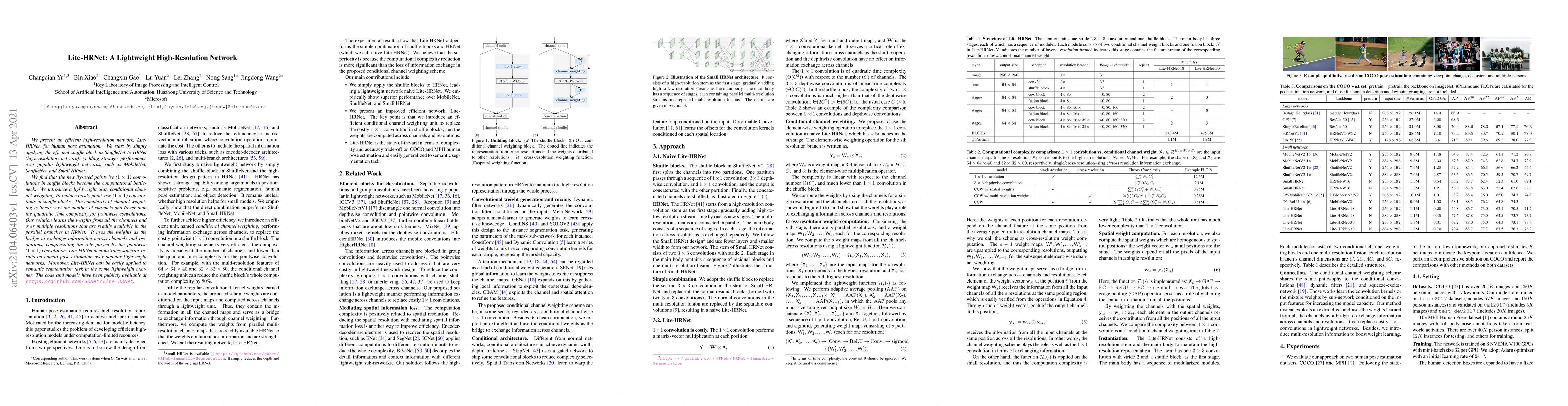 Lite-HRNet is an efficient high-resolution network for human pose estimation that integrates the shuffle block from ShuffleNet into HRNet, achieving better performance than MobileNet, ShuffleNet, and Small HRNet. It replaces costly pointwise convolutions with a lightweight conditional channel weighting unit, reducing computational complexity and improving performance.
