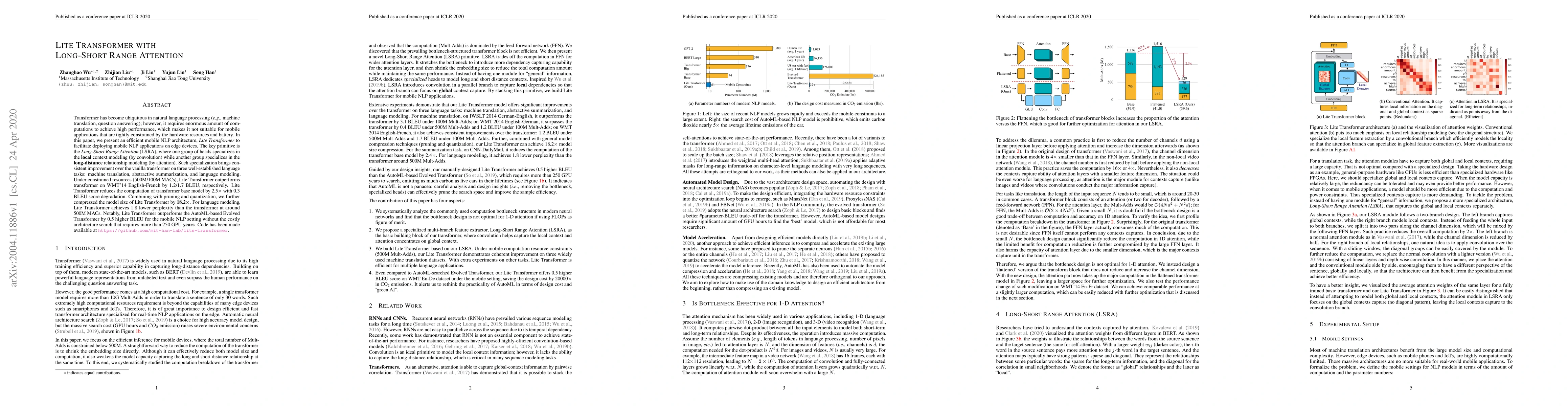 This paper introduces a Lite Transformer architecture designed for efficient deployment on mobile devices, featuring Long-Short Range Attention to reduce computational demands. It outperforms the standard Transformer on multiple NLP tasks while significantly reducing model size and computation, achieving better results without the need for extensive architecture search.