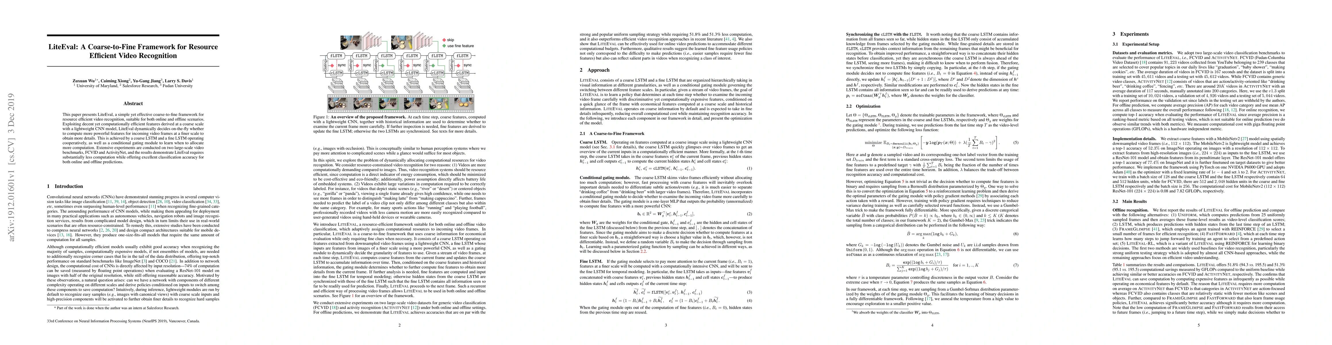 LiteEval is a resource-efficient coarse-to-fine framework for video recognition using a lightweight CNN and LSTMs, dynamically adjusting feature computation to optimize performance and accuracy. Experiments on FCVID and ActivityNet show it achieves high accuracy with significantly reduced computational costs.