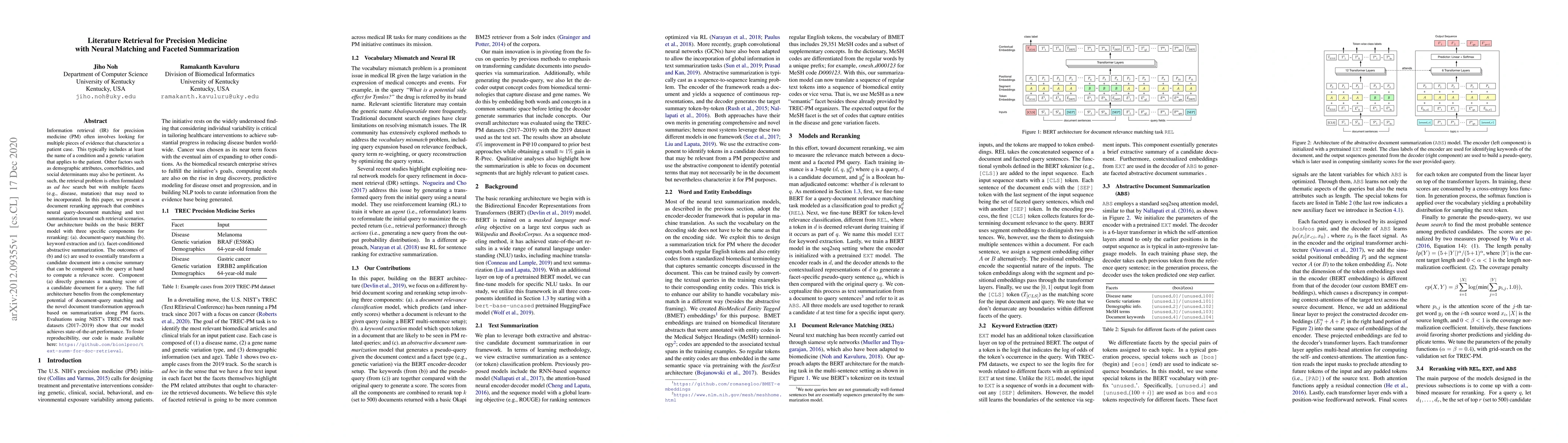 This research paper presents a novel approach to information retrieval for precision medicine that combines neural query-document matching with text summarization to improve search results.