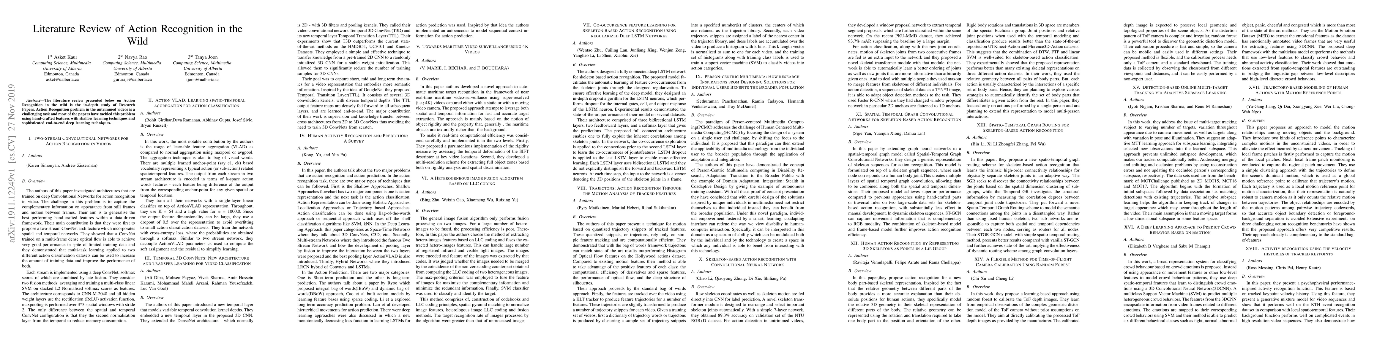 The literature review presented below on Action Recognition in the wild is the in-depth study of Research Papers. Action Recognition problem in the untrimmed videos is a challenging task and most of the papers have tackled this problem using hand-crafted features with shallow learning techniques and sophisticated end-to-end deep learning techniques.