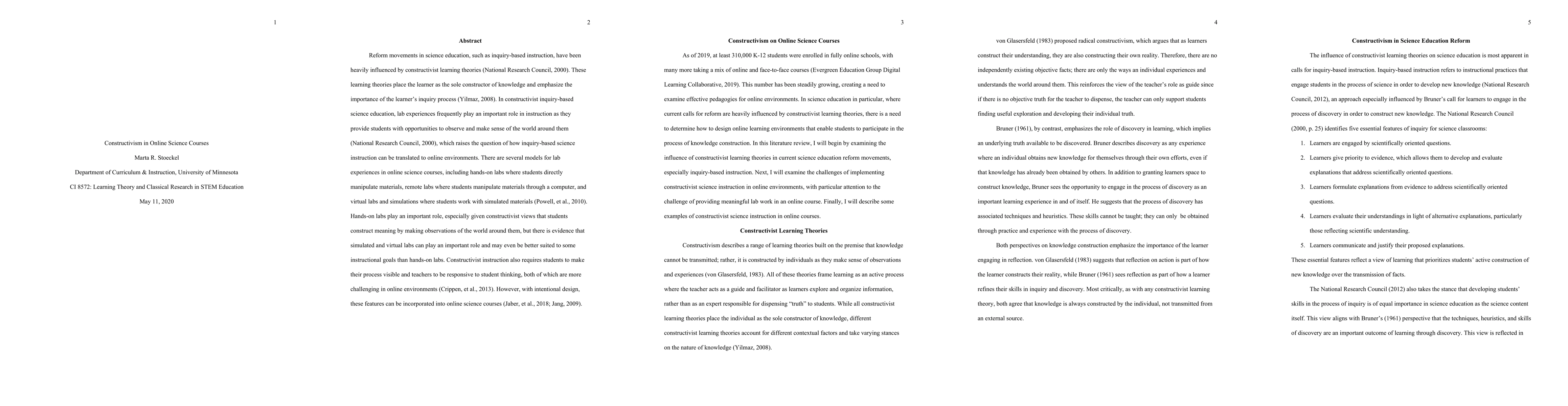 This literature review explores how constructivist learning theories influence inquiry-based science education, emphasizing the role of lab experiences in both traditional and online settings. While hands-on labs are crucial, simulated and virtual labs may better meet certain instructional goals, and with thoughtful design, constructivist principles can be effectively implemented in online environments.