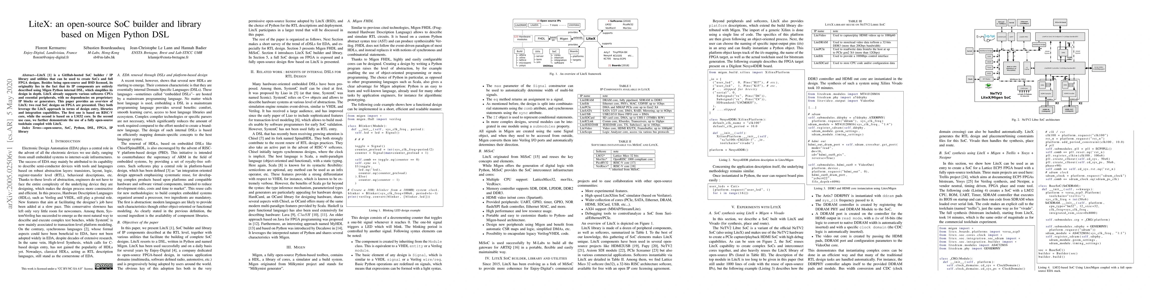 LiteX is an open-source SoC builder and library using Migen Python DSL for FPGA design, featuring no proprietary dependencies. It showcases two FPGA-based SoC designs, one with a RISC-V core and another with a LM32 core, demonstrating its design entry and integration capabilities.