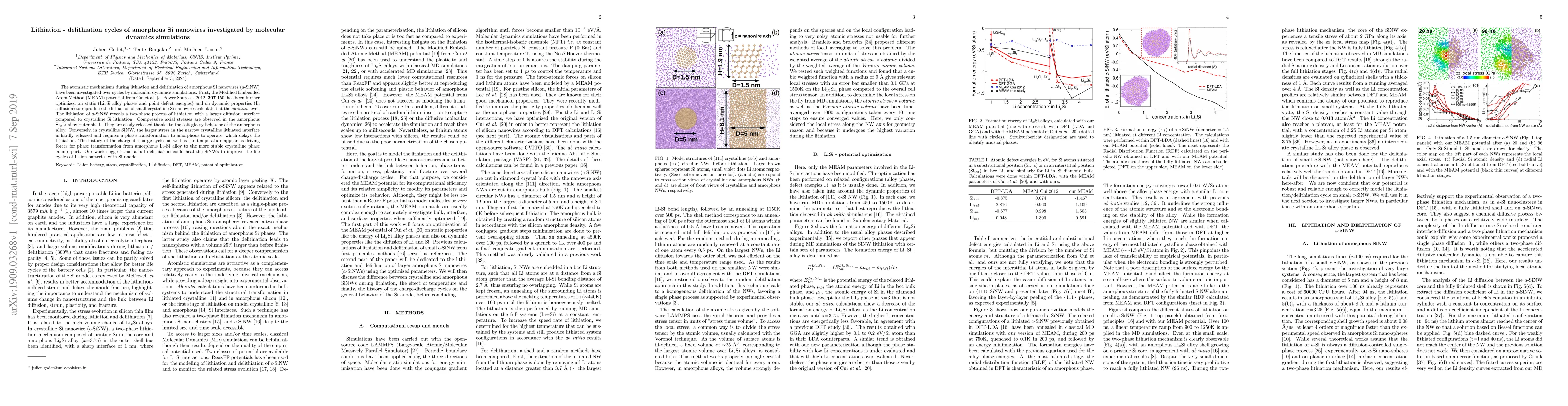 This paper investigates the lithiation-delithiation cycles of amorphous Si nanowires using molecular dynamics simulations, revealing a two-phase process with larger diffusion interfaces compared to crystalline Si. The amorphous silicon alloy exhibits compressive axial stresses that are easily released, potentially improving the life cycle of Li-ion batteries with Si anode.