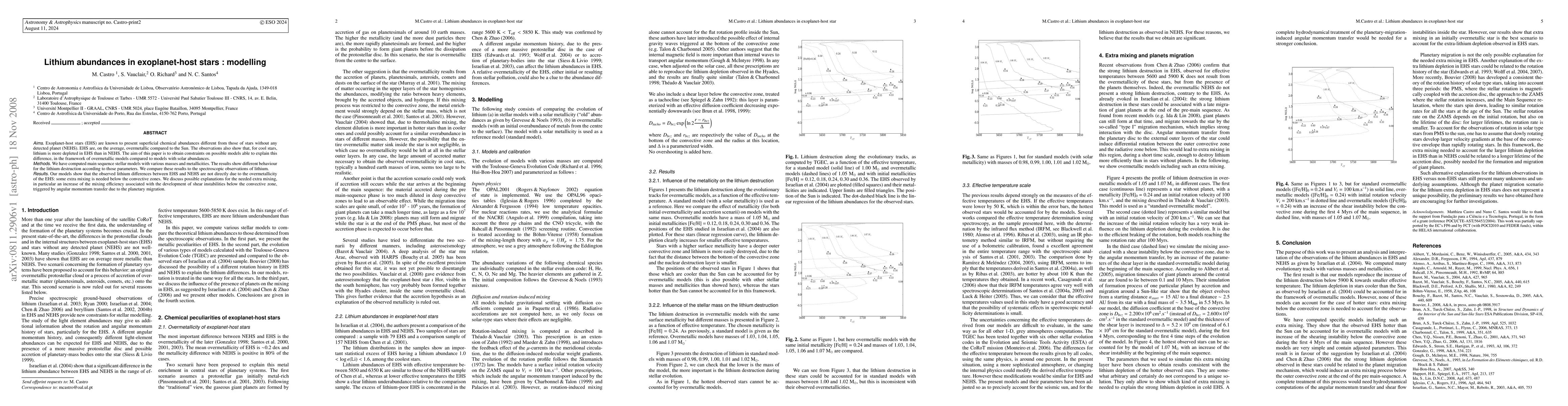 This paper investigates lithium abundances in exoplanet-host stars (EHS) and finds that observed differences in lithium depletion are not solely due to overmetallicity. It suggests that additional mixing below convective zones, possibly driven by shear instabilities from planetary migration, is necessary to explain the observed lithium depletion.